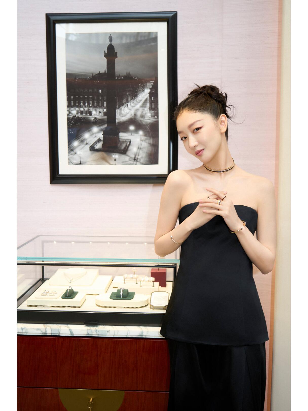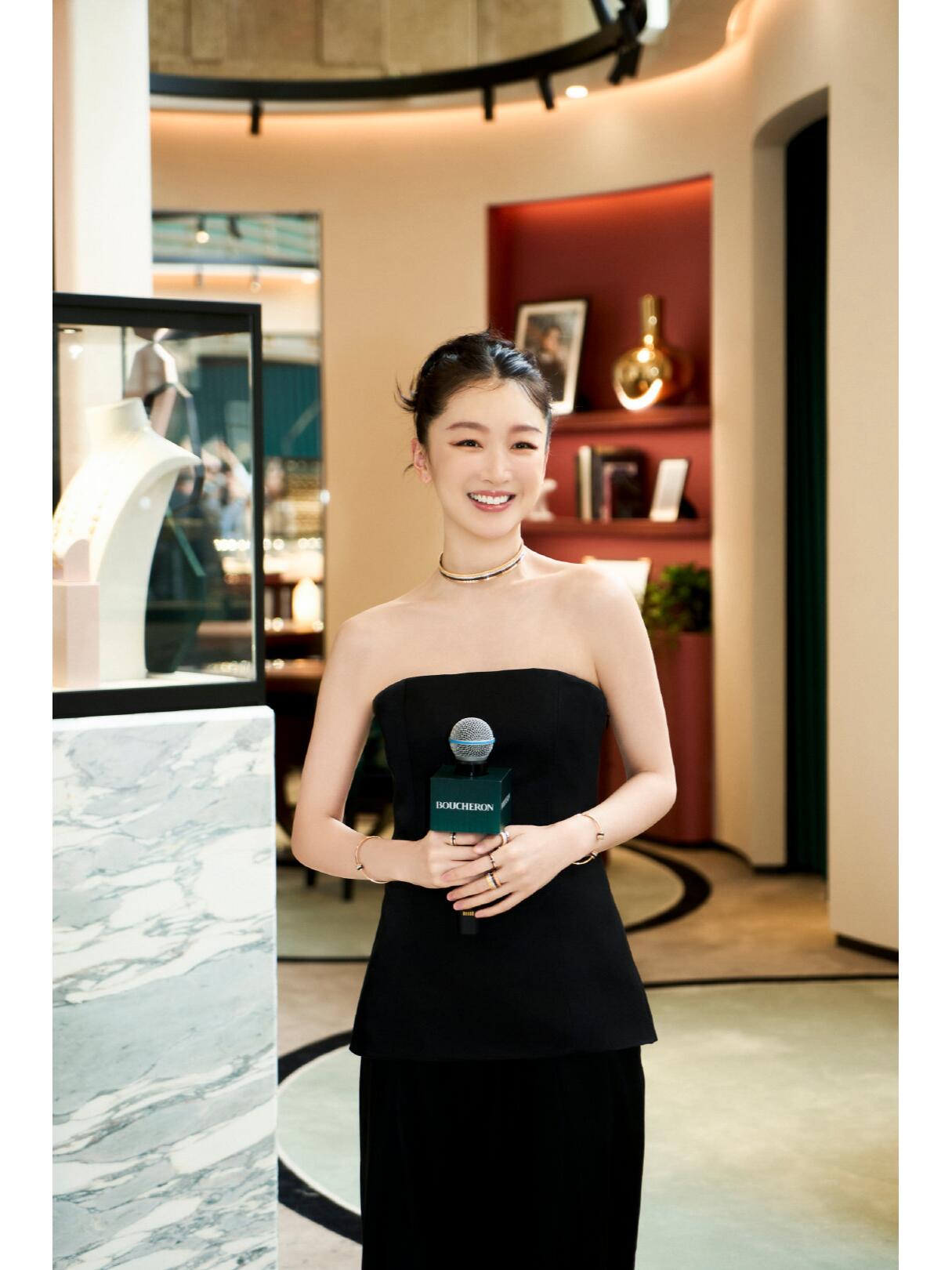 她这套造型很不错,头发盘起来。利落有大气。穿一件黑色抹胸的短上衣,配一条黑色阔腿裤。周冬雨还是很适合这种抹胸加长裤的造型,显得人很修长。