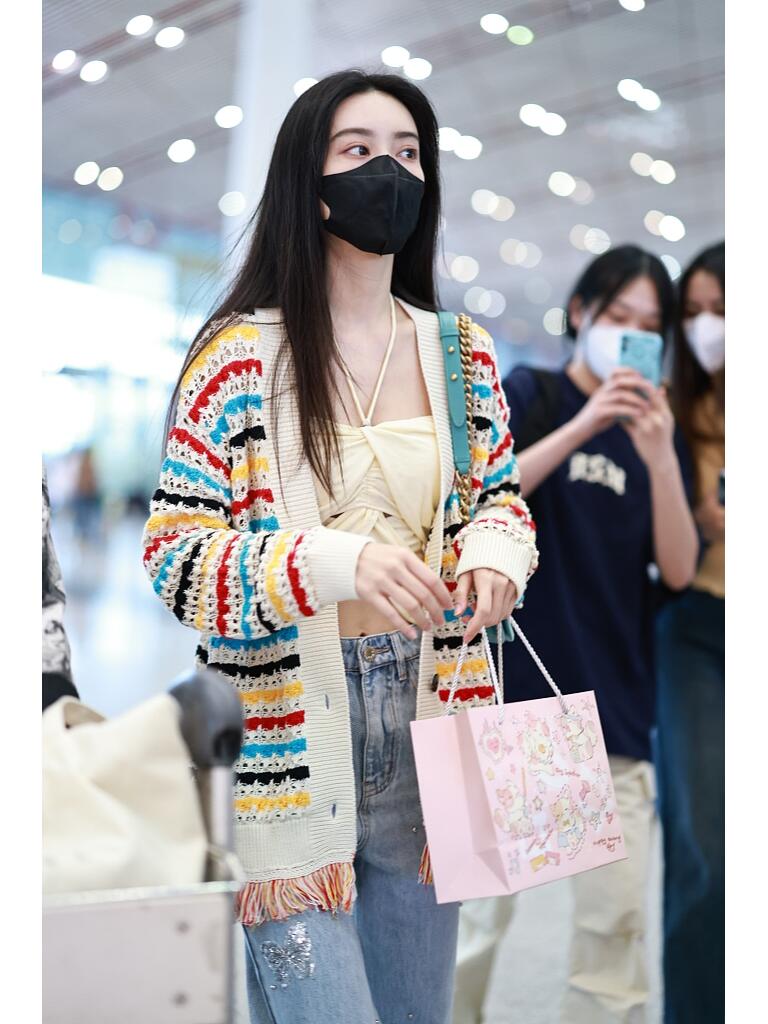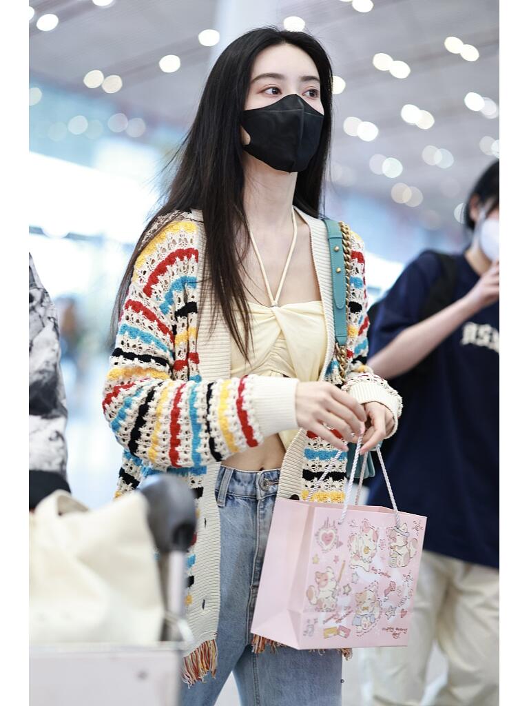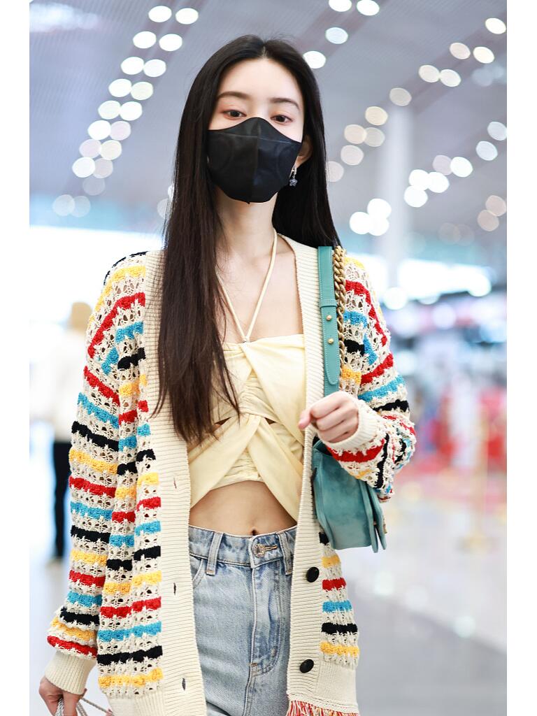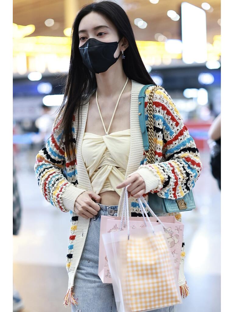 她穿了一件白色为主调的彩色条纹针织开衫,这开衫的下摆是流苏装饰,有细节感,同时也不单调。她内搭了一件米白色的绑带露腰小背心。搭配浅蓝色牛仔直筒长裤,脚上是双拼色厚底运动鞋。简单大方又带点复古的韵味。