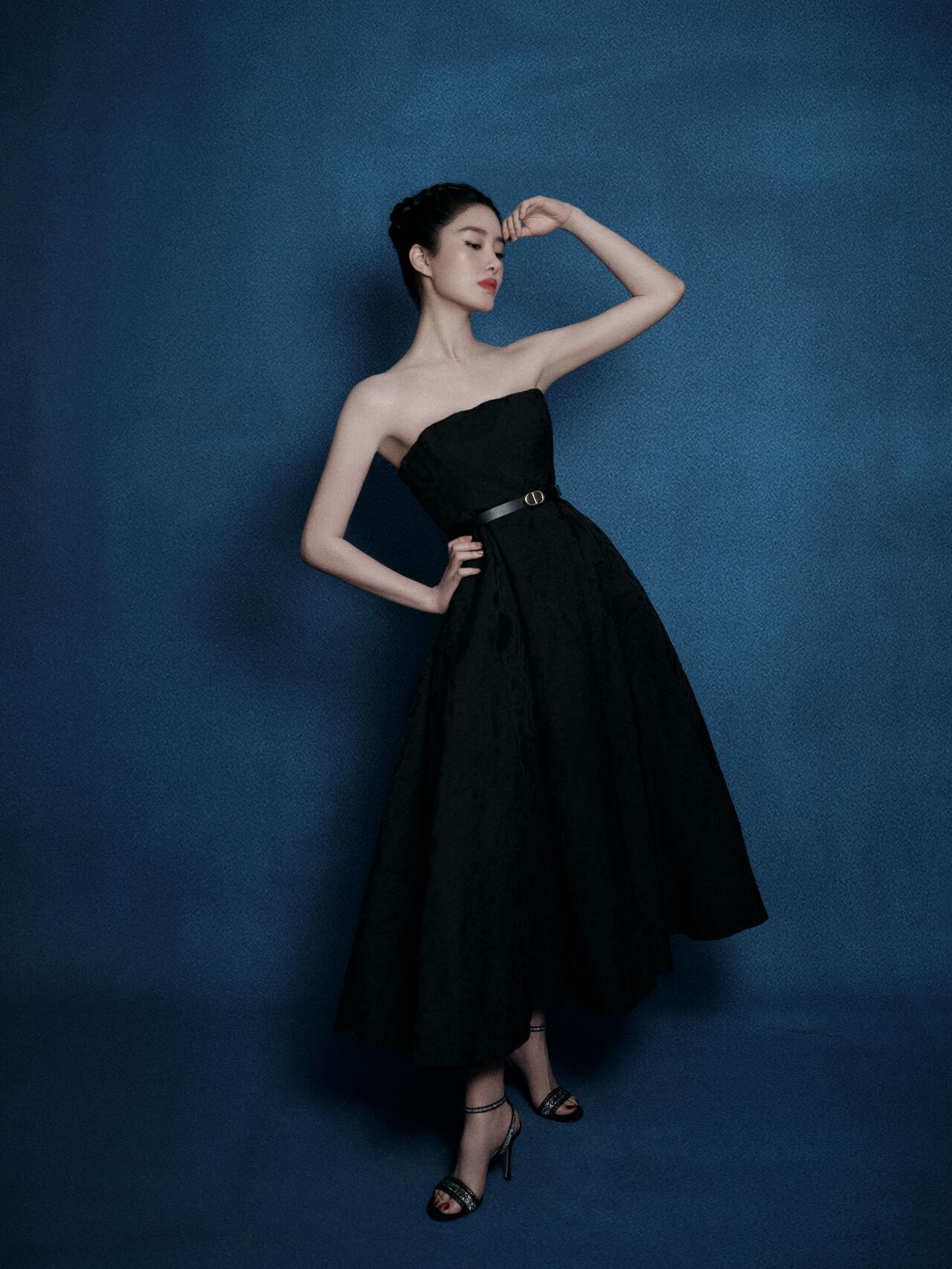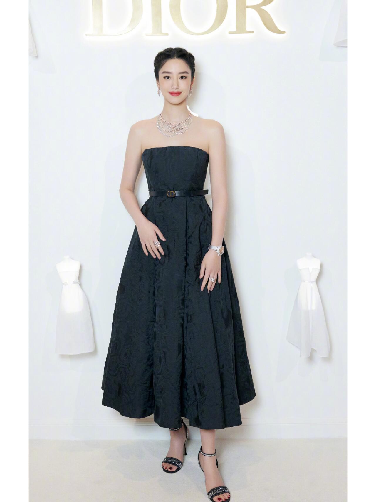 她也太好看了吧.头发盘起来,利落优雅,穿一件黑色的抹胸连衣裙,这裙子是收腰的薄纱的裙子,裙长过了膝盖。露出一截小细腿,优雅复古又浪漫.