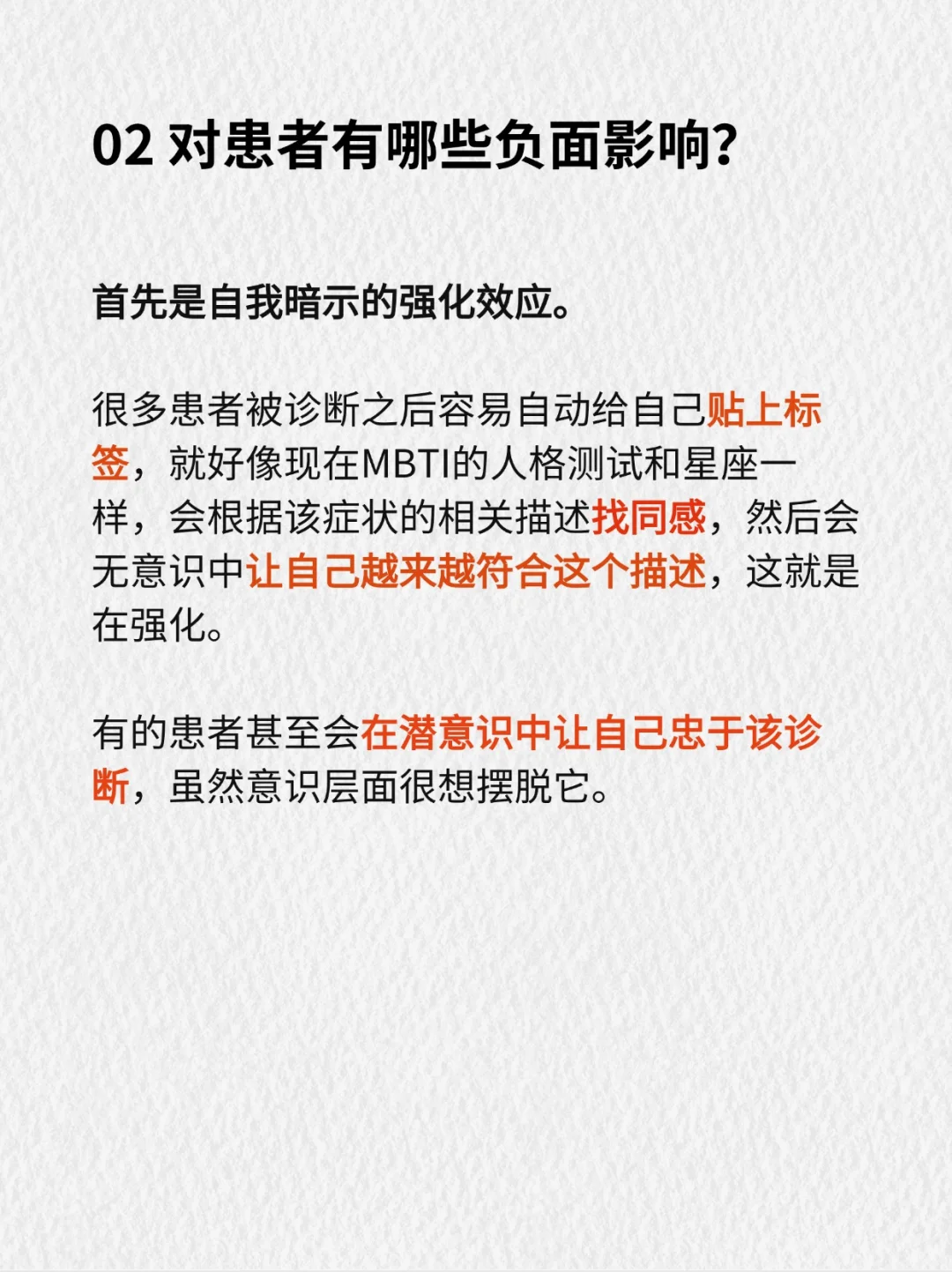 很多患者被诊断之后容易自动给自己贴上标签,就好像现在MBTI的人格测试和星座一样,会根据该症状的相关描述找同感,然后会无意识中让自己越来越符合这个描述,这就是在强化。