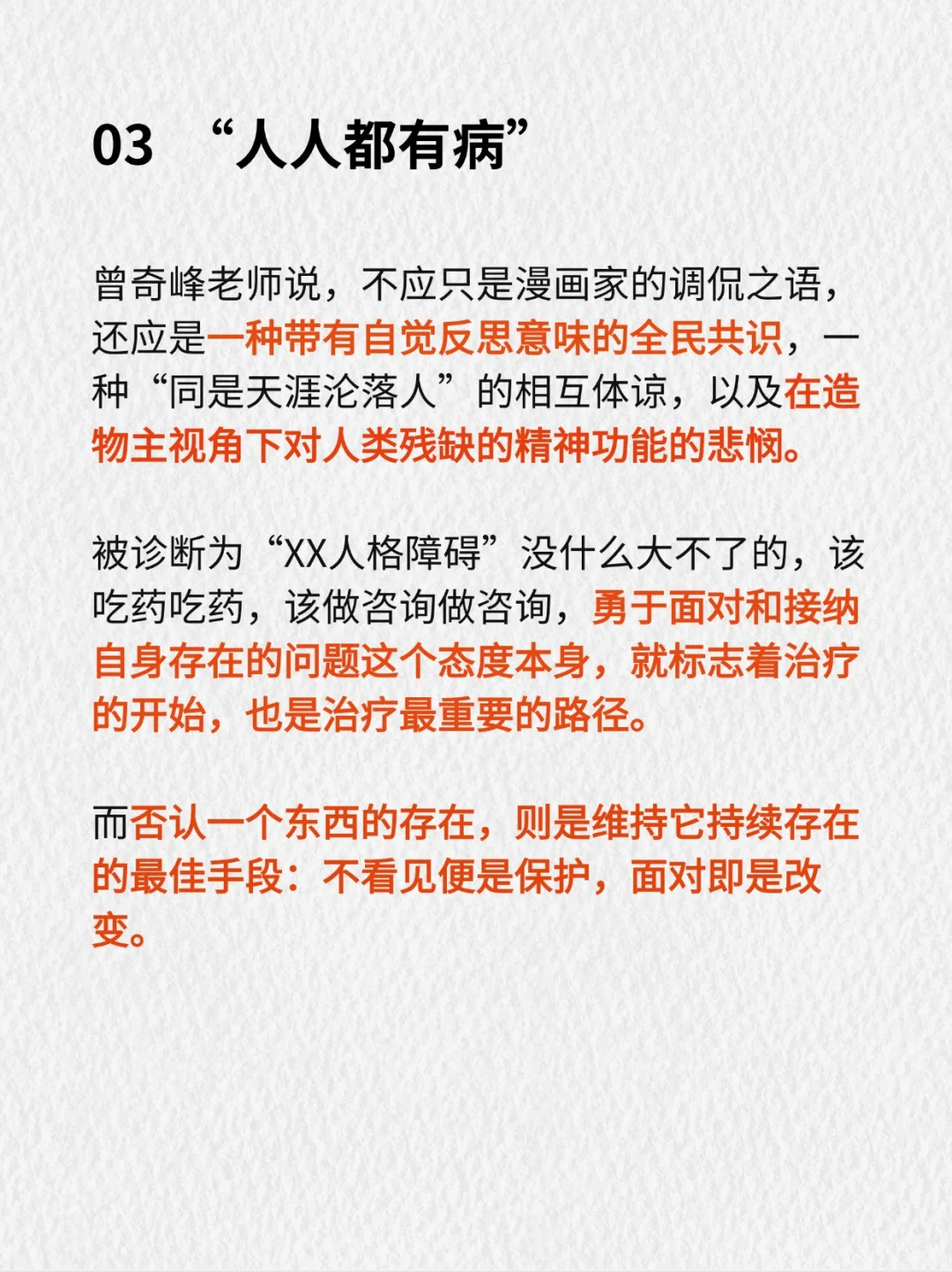 曾奇峰老师说,不应只是漫画家的调侃之语,还应是一种带有自觉反思意味的全民共识,一种“同是天涯沦落人”的相互体谅,以及在造物主视角下对人类残缺的精神功能的悲悯。