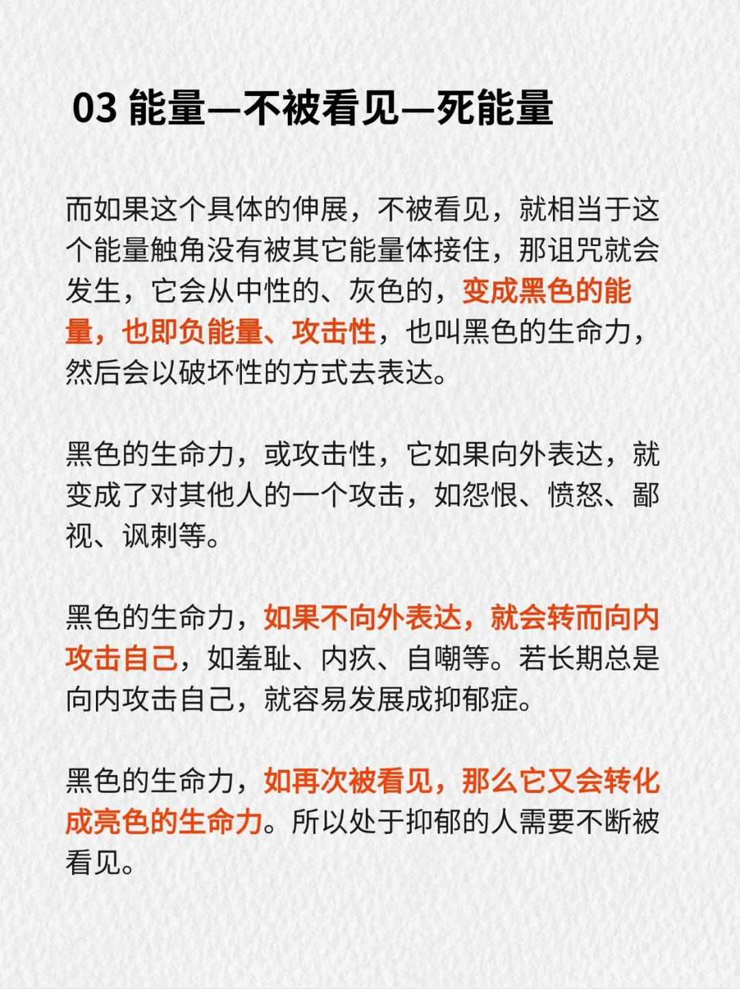 而如果这个具体的伸展,不被看见,就相当于这个能量触角没有被其它能量体接住,那诅咒就会发生,它会从中性的、灰色的,变成黑色的能量,也即负能量、攻击性,也叫黑色的生命力,然后会以破坏性的方式去表达。