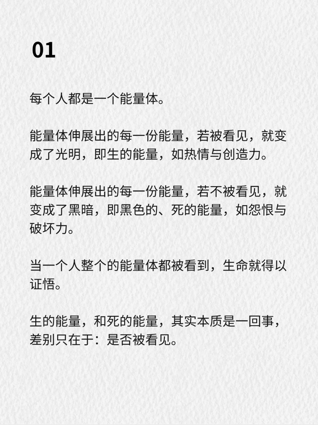 能量体伸展出的每一份能量,若不被看见,就变成了黑暗,即黑色的、死的能量,如怨恨与破坏力。
