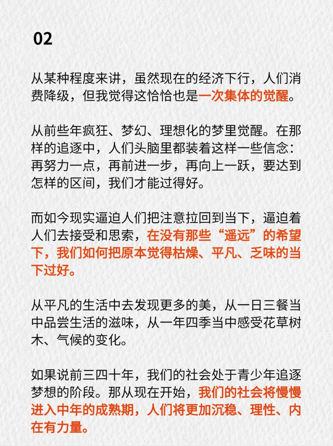 如果说前三四十年,我们的社会处于青少年追逐梦想的阶段。那从现在开始,我们的社会将慢慢进入中年的成熟期,人们将更加沉稳、理性、内在有力量。