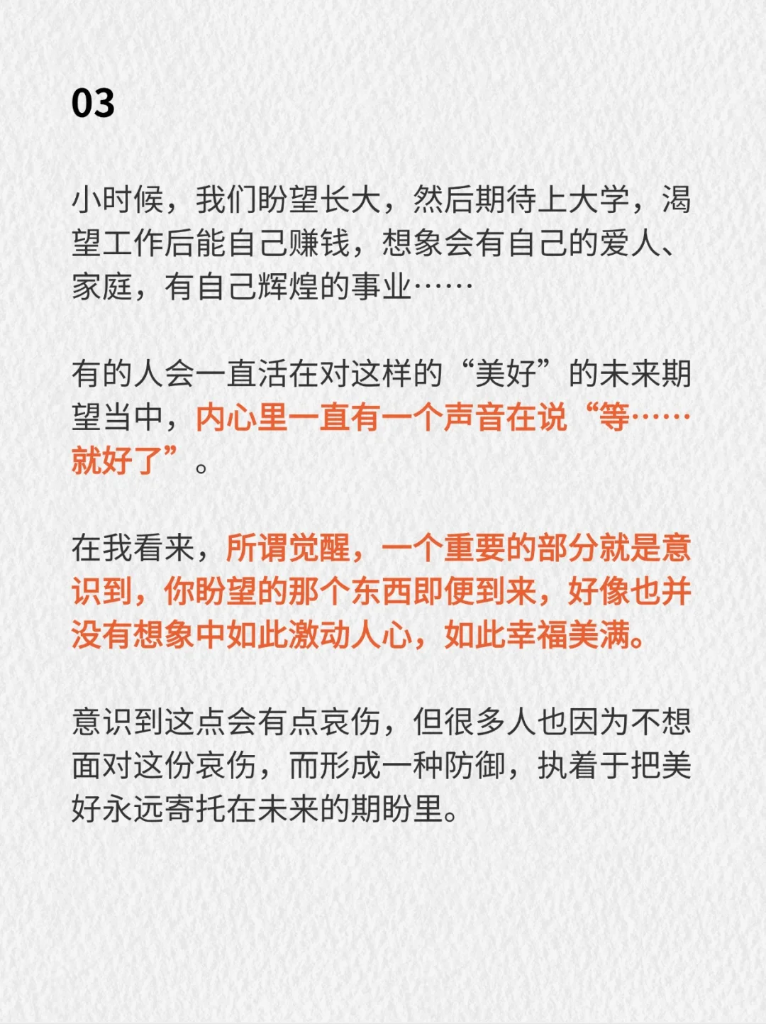 在我看来,所谓觉醒,一个重要的部分就是意识到,你盼望的那个东西即便到来,好像也并没有想象中如此激动人心,如此幸福美满。