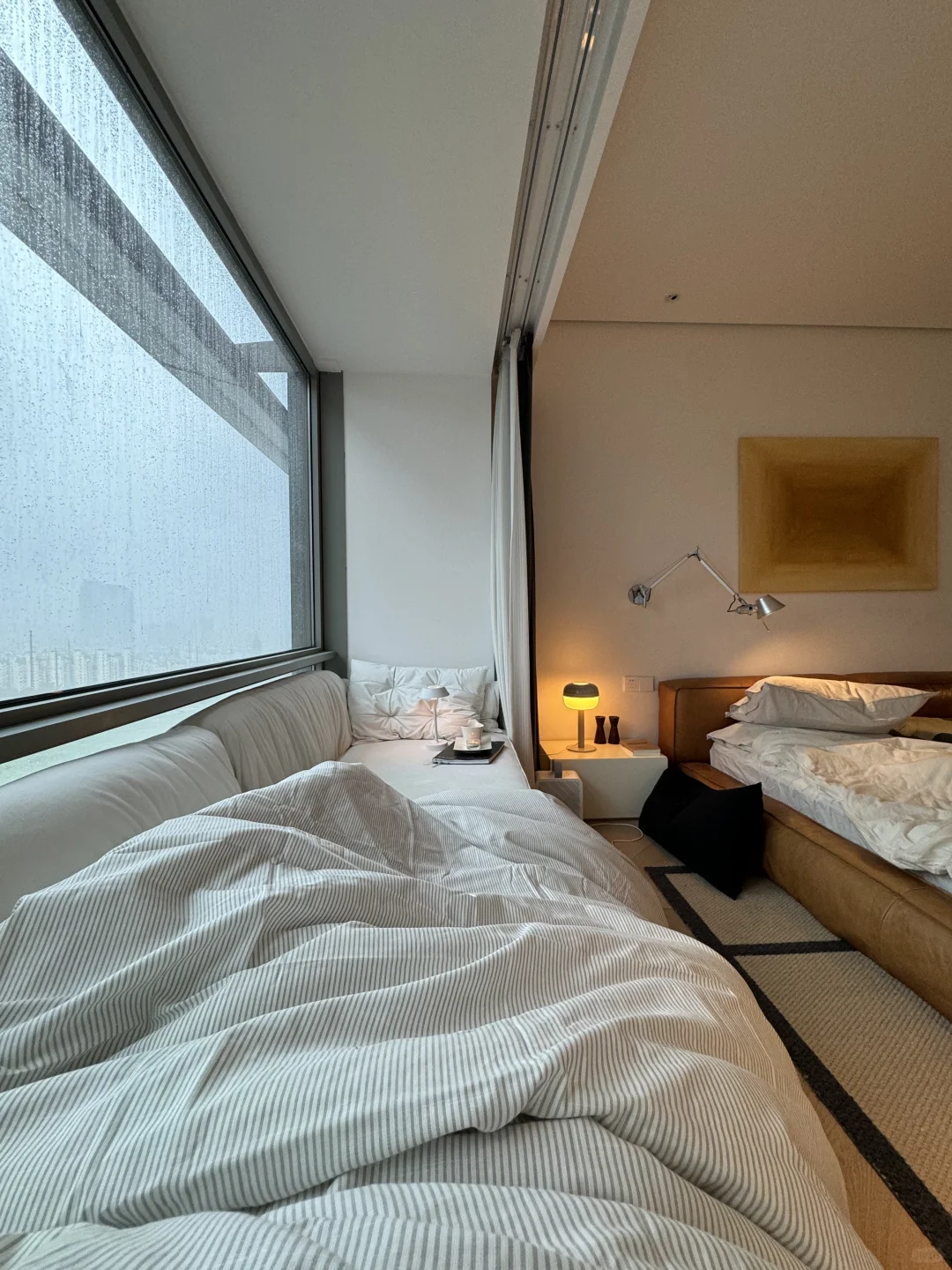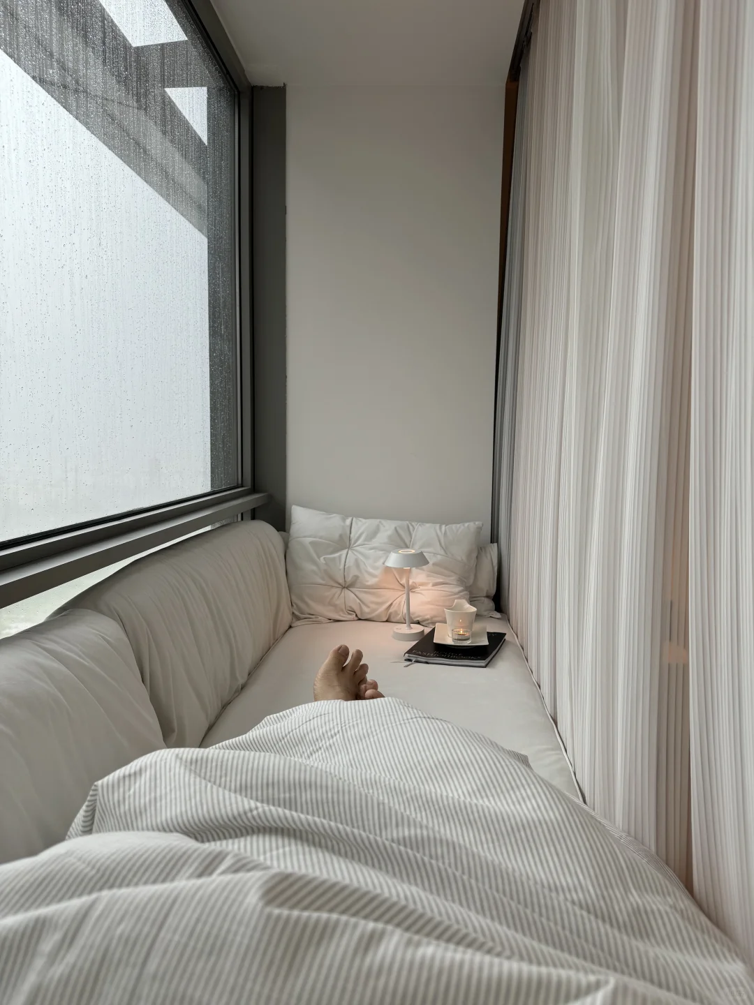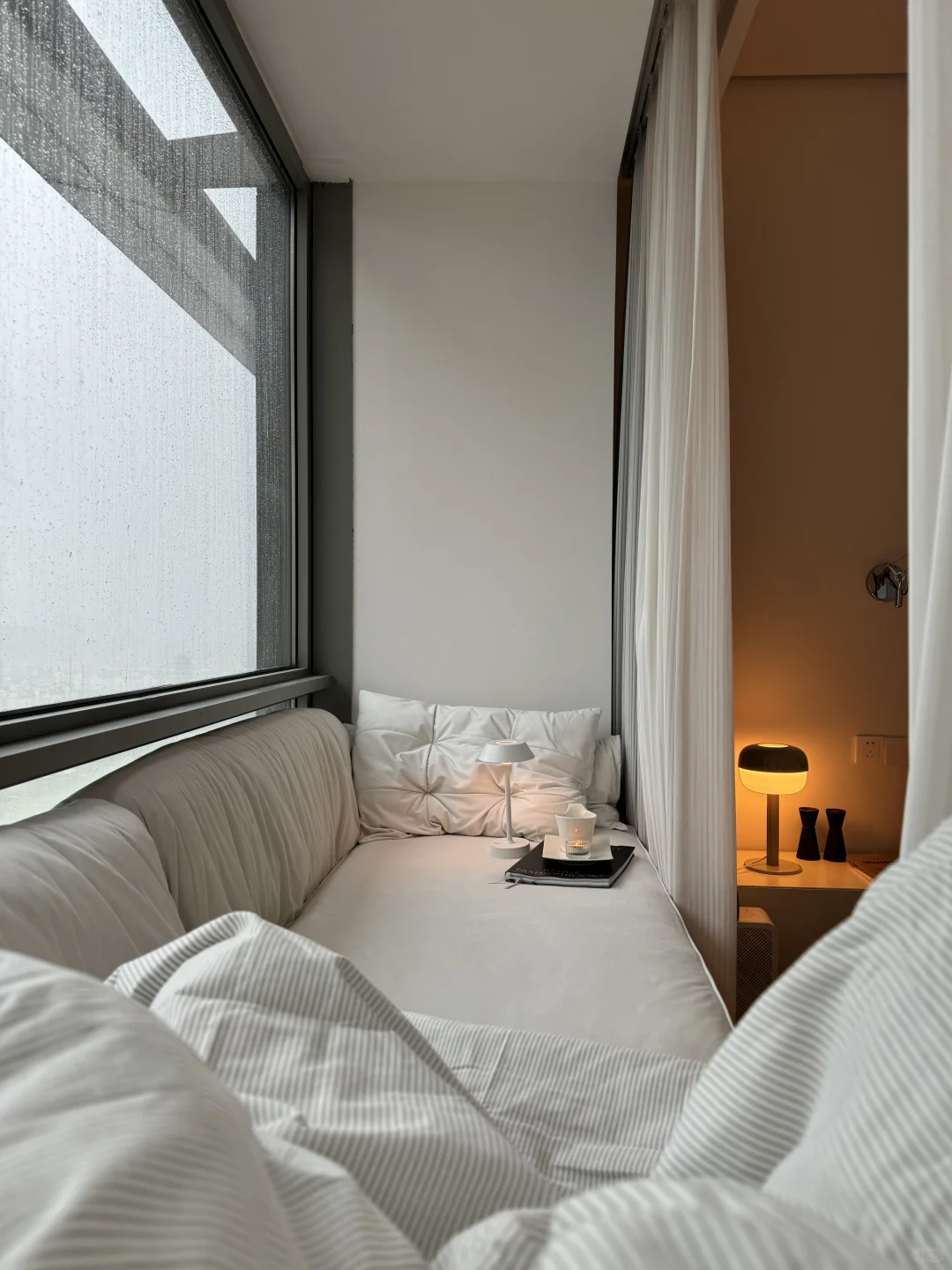 下雨天 窝在挂满雨珠的玻璃窗前 抱着小狗 美美的睡一觉