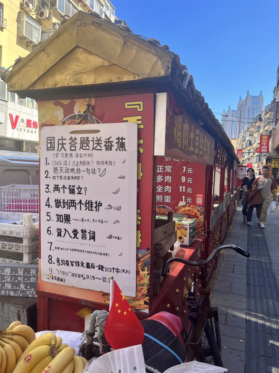 在南洪街溜达,看到一个招牌:回答出“四个意识”、“两个确立”、“两个维护”或者背诵入党誓词就可以获得香蕉🍌🍌🍌