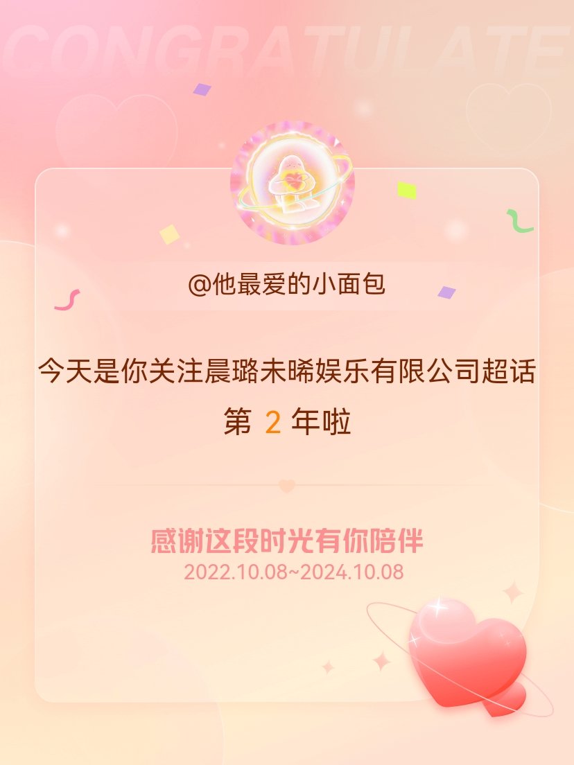 #晨璐未晞娱乐有限公司[超话]#今天是我关注超话的第2年,希望能继续伴你一路前行~