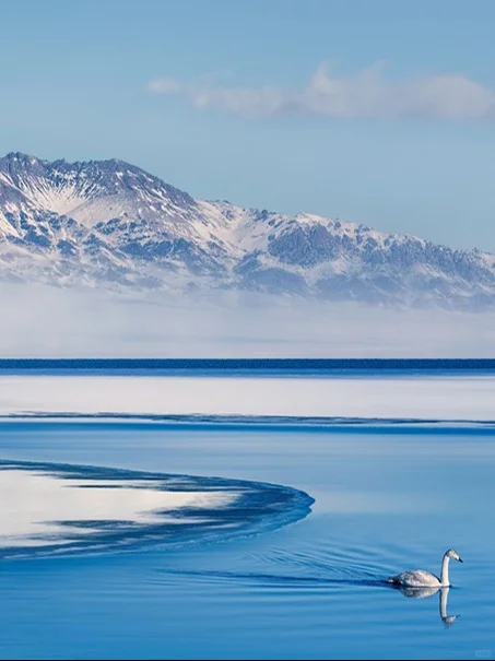 3⃣赛里木湖 被誉为“大西洋的最后一滴眼泪”,冬季晶莹剔透的冰块,会散发出幽深的蓝色光芒,还有冰泡奇观,倒映着雪山松林、蓝天白云