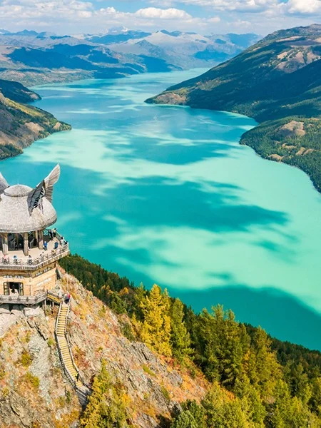 ▫登上喀纳斯观鱼台,俯瞰喀纳斯湖全景,欣赏“蓝宝石”的耀眼湖光
