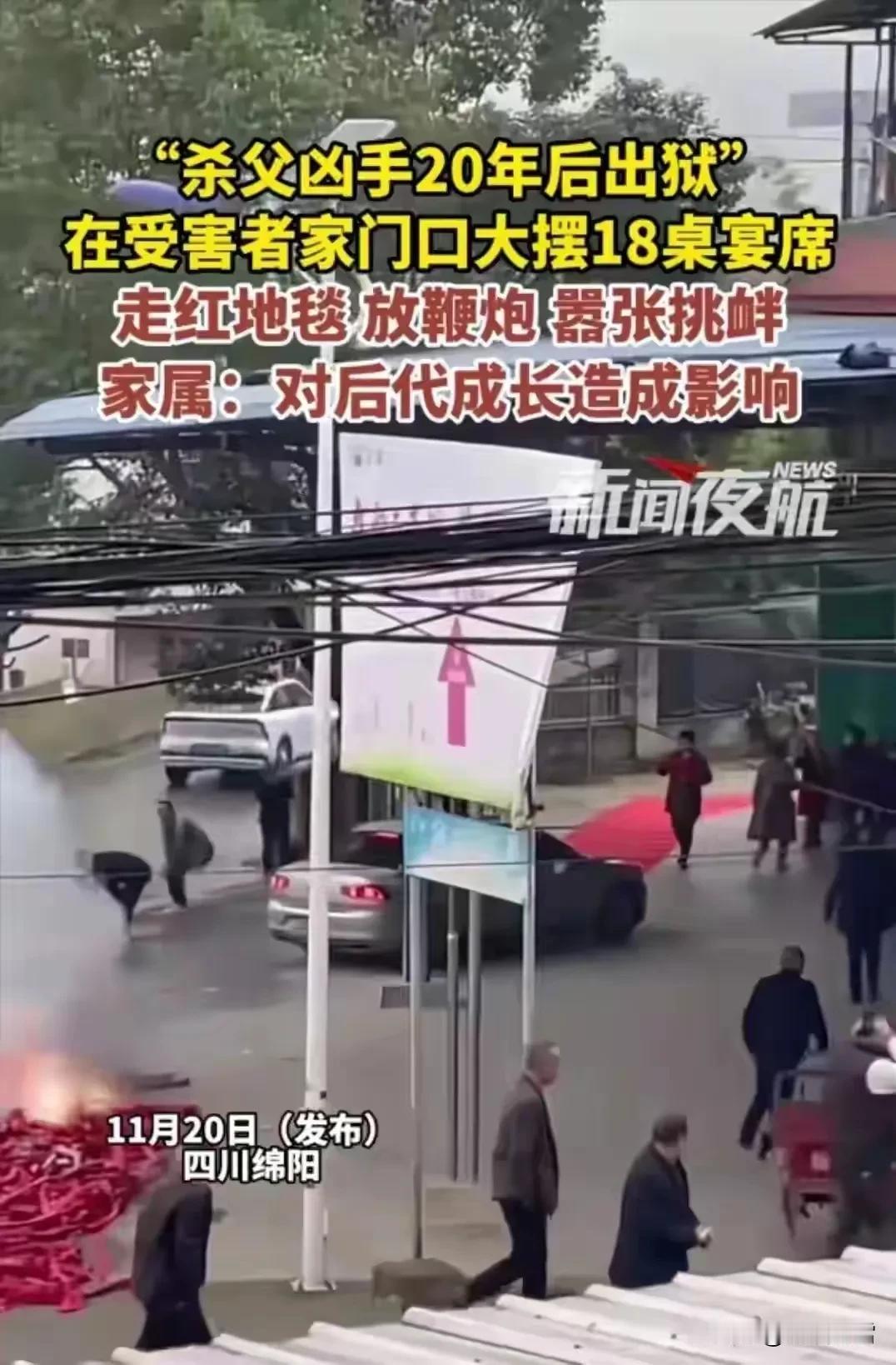 天狂必有雨,人狂必有祸,今日四川绵阳一刑满释放的杀人犯,在家门口摆下18桌酒席,鞭炮齐鸣,红毯铺地,庆祝自己的出狱,就这样的行为,肯定是没有改造好,最好是让他进去继续努力改造一辈子,比较好奇的是这种凶手为什么会被释放?这世道太炸裂了