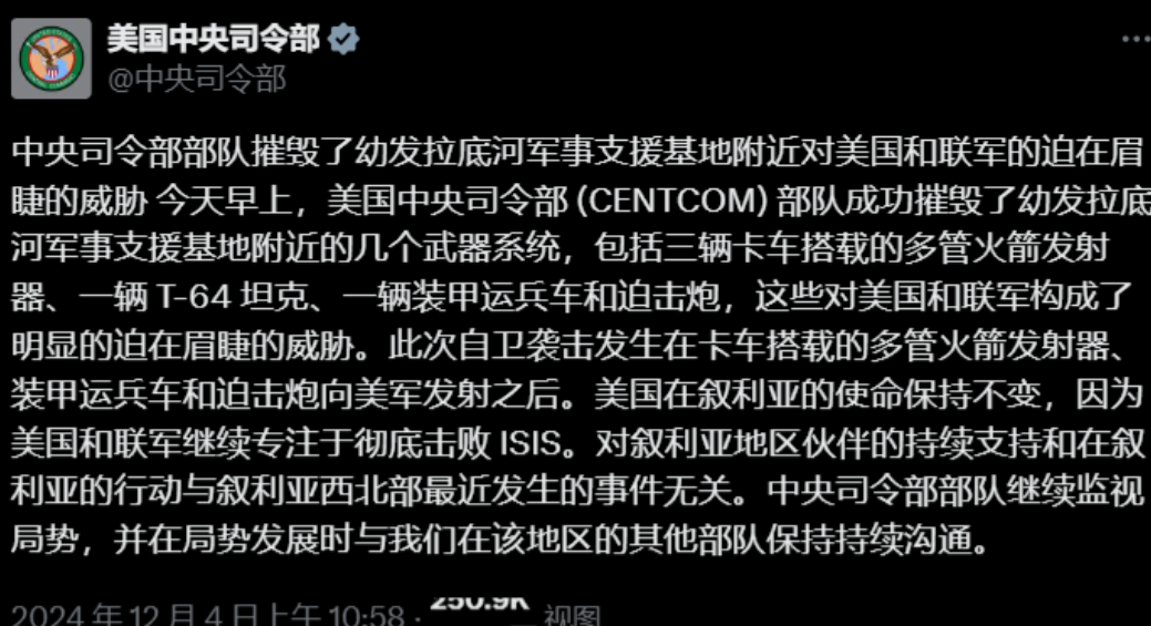 大马士革危在旦夕,美军火上浇油,普京或许救不了阿萨德了 在哈马攻防战胶着几天后,叙利亚政府军还是没能守住哈马市,哪怕是在“老虎哈桑”的指挥下,说句实话,就政府军现在的战斗力,神仙来了都没用啊。如今战火已经烧到了大马士革,反对派武装化整为零,小股部队迅速穿插到了叙利亚首都,无人机也已经开始发起攻击。 就在这时,库尔德武装突然向代尔祖尔附近的政府军发起进攻,政府军根本无法阻挡有着美军空中支援的库尔德武装,美军还公布了空袭的战果,摧毁了三辆多管火箭炮、一辆坦克、一辆装甲运兵车和几门迫击炮,不过美军称是因为他们先对美军攻击后才反击的。 显然是库尔德武装准备趁着叙利亚各个武装的注意力都放在西北部的战局时,扩张自己的控制范围。 虽然普京仍然试图挽救阿萨德,还紧急在地中海安排了一场军演,试图进行震慑,但是反对派武装的背后也有其他势力支持,单纯的震慑军演毫无实际作用。在正面战场光靠俄空天军的轰炸无法解决根本问题,哪怕政府军稍微能打一点,也不至于败得这么快。