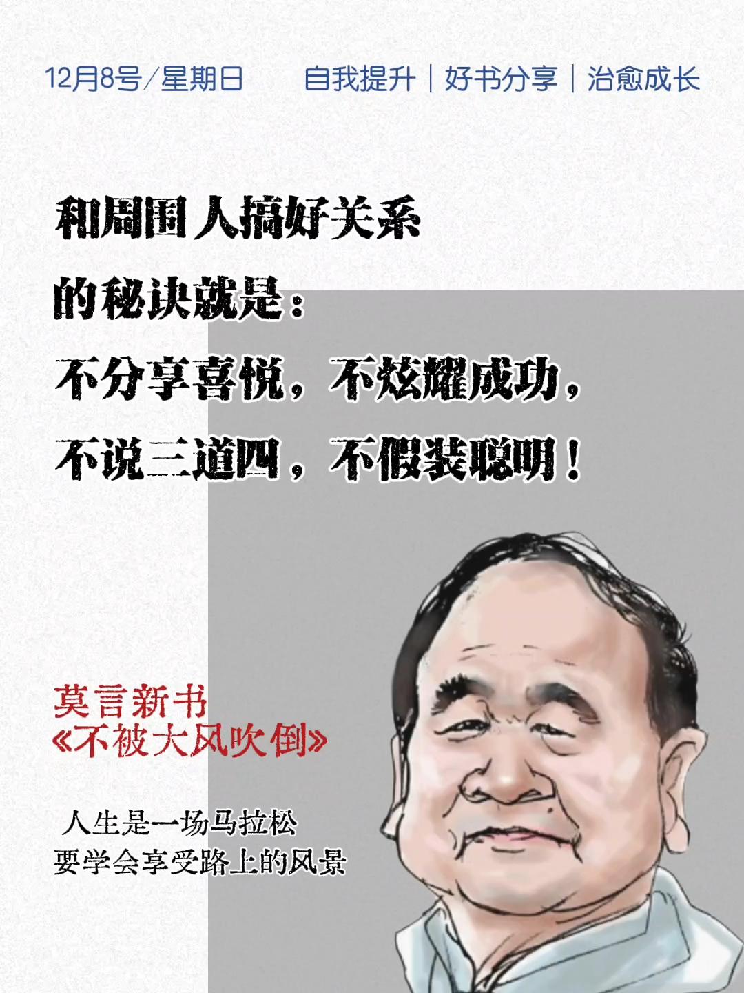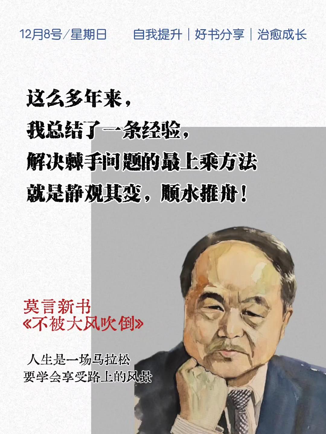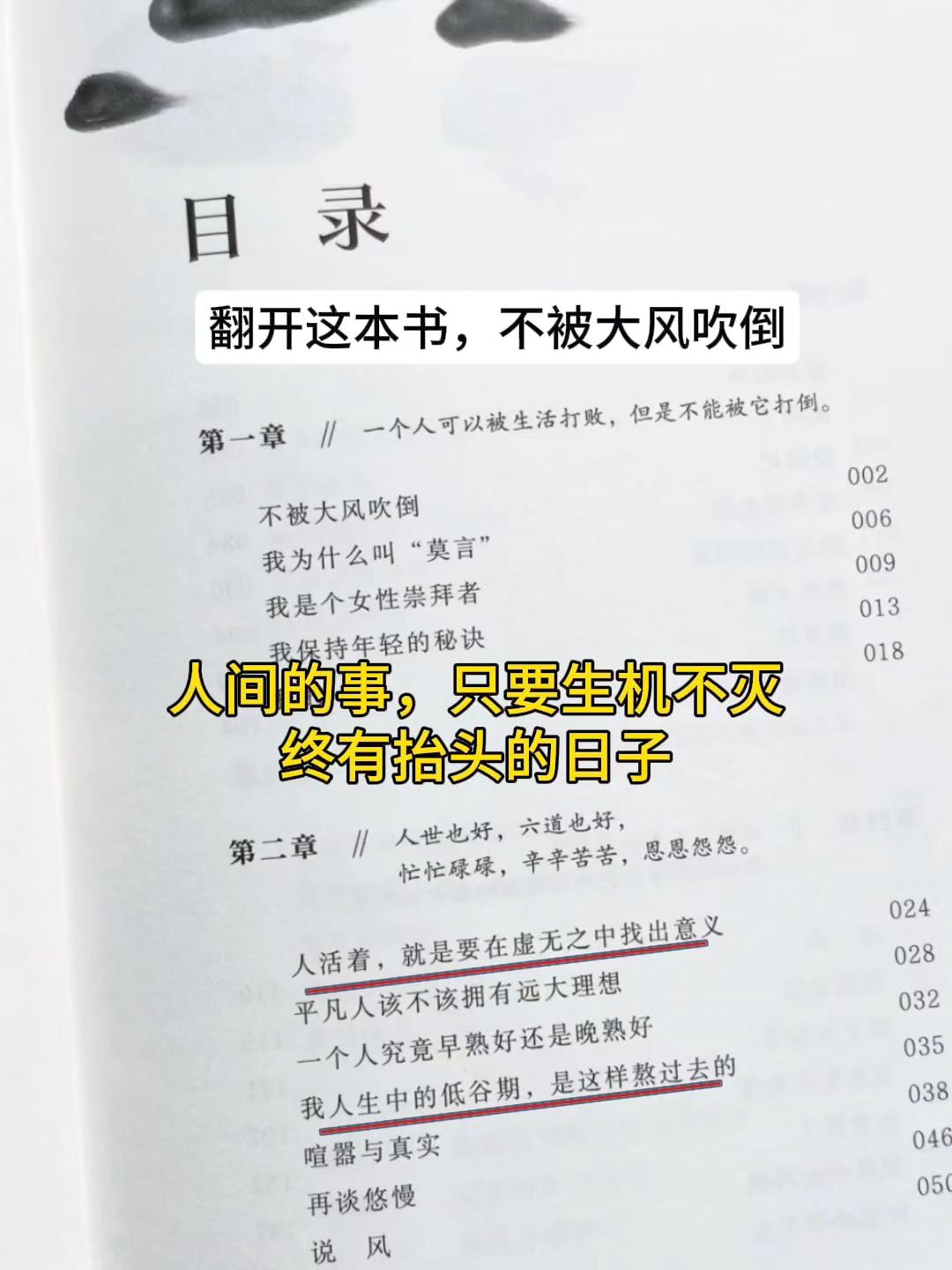 这一次真的被莫言老师治愈了!!!他的散文集《不被大风吹倒》没有大道理,只有平常的故事,是一本写给低谷期读者的书,他说“睡前原谅一切,醒来便是重生”,温暖又治愈,读完充满勇气,砥砺前行