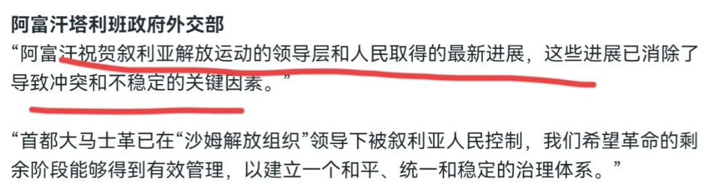 塔利班的表态让人玩味!叙利亚一夜变天,塔利班竟然罕见的跟美国一个立场,乐见叙利亚正在发生的一切。阿富汗塔利班外交部发表声明表示,阿富汗祝贺叙利亚解放运动的领导层和人民取得的最新进展,这些进展已消除了导致冲突和不稳定的关键因素。