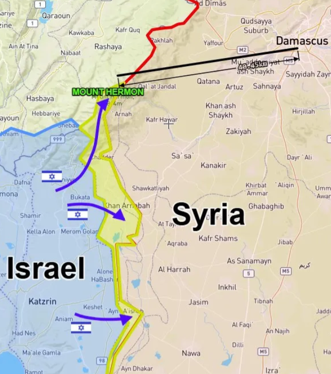 以色列不仅空军出动,地面部队前出戈兰高地,占领了叙利亚2800米的最高峰黑门山,这是一个战略制高点,将整个大马士革一收眼底,可同时辐射黎巴嫩和大马士革。 这波趁火打劫,至少目前来看赢麻了,部署清晰,时机把握得真是好!