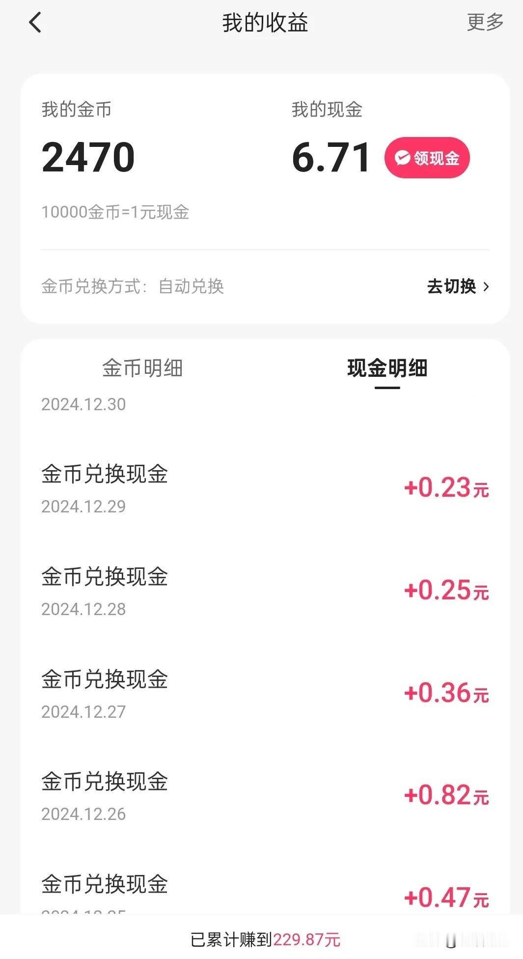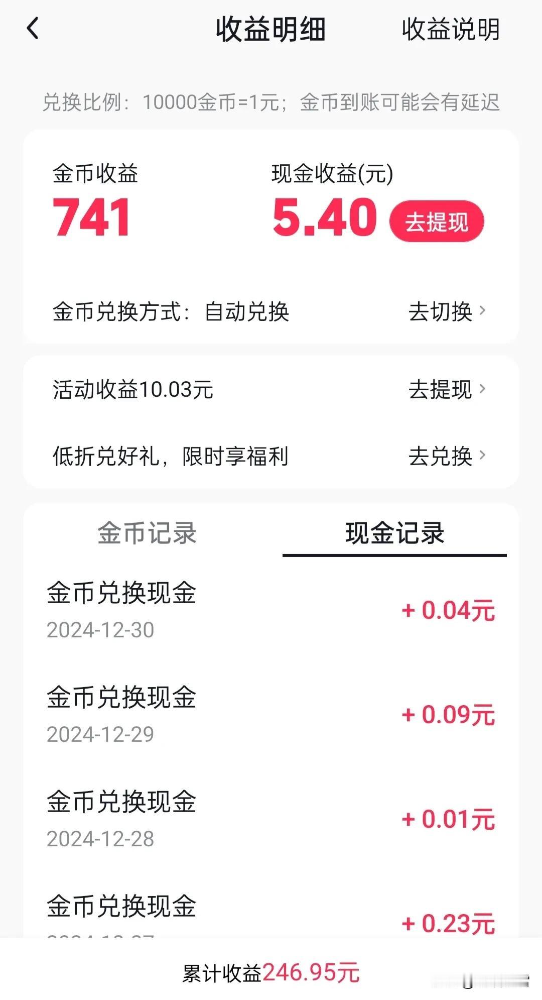 年底大盘点,2024年我薅羊毛的收益如下:头条极速版:120.64元。快手极速版:229.89元,抖音极速版:246.95元,合计600.08元,这是我在这三个app上薅羊毛的收益,虽然不多,但是都是自己利用空余时间赚到的,展望未来,2025年我会薅到更多的收益,愿今后的日子更加红红火火,生意兴隆,财源广进!