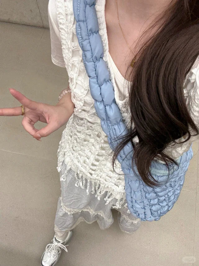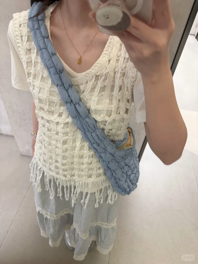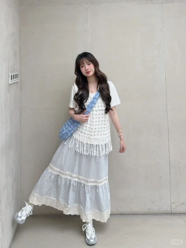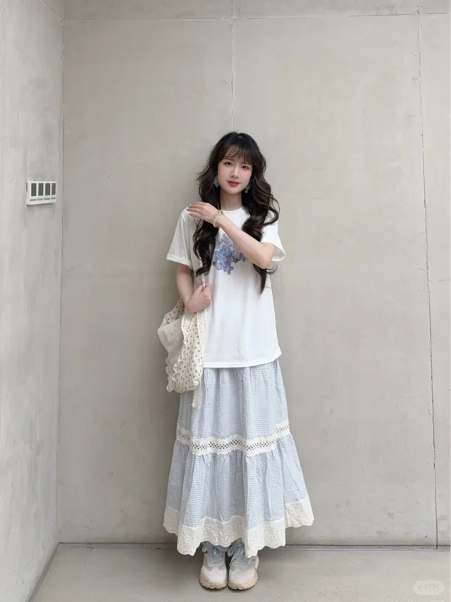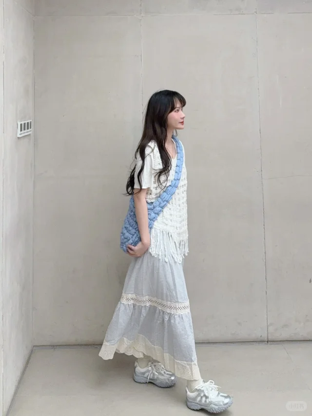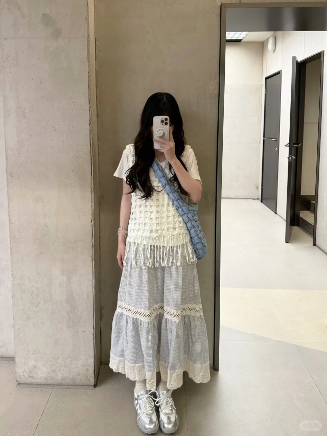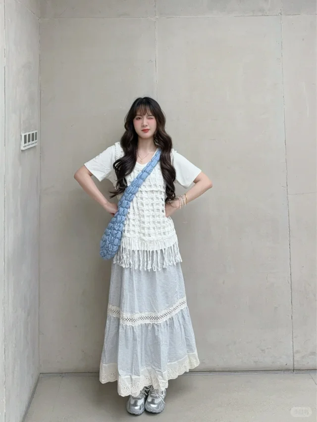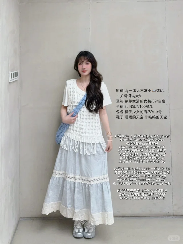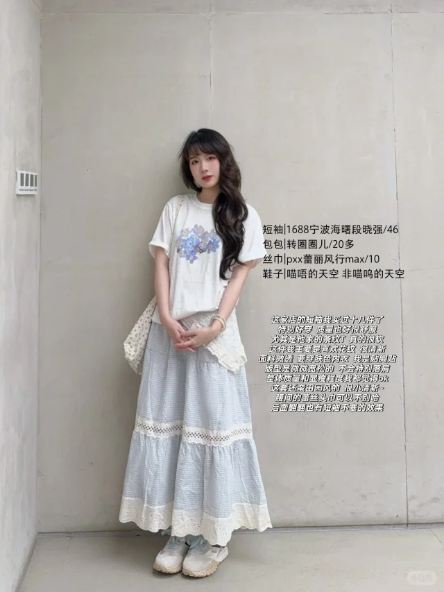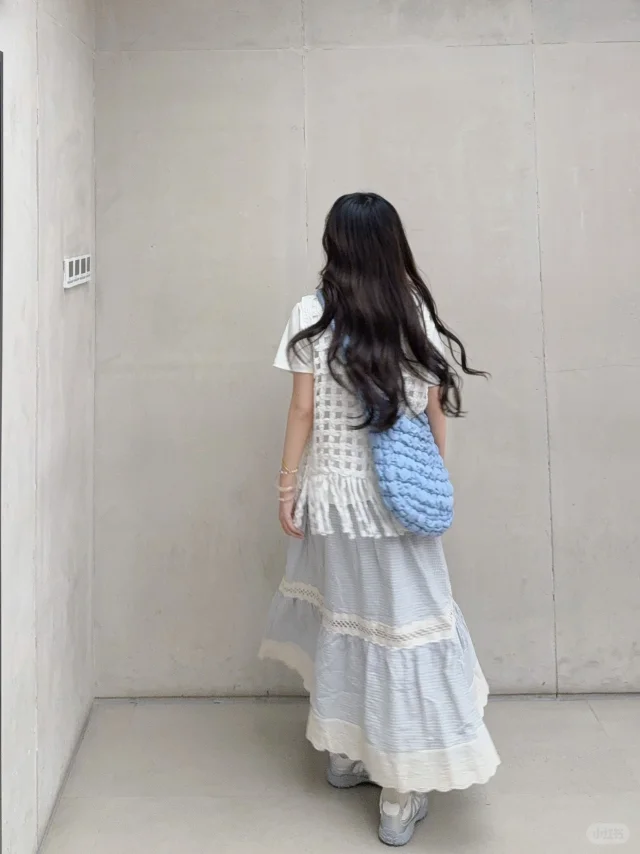 168/107 这套真的有点复刻23年那套青岛穿搭 不过是夏季版 很适合海边的一套 拍照出片穿着有很舒服的一套~ 搭配罩衫或者短袖都挺好看的 天冷了外套还可以搭配一件皮衣夹克 也是很亮眼 好喜欢蓝白搭配 真的很乖很清新🫰🏻 裙子也可以搭配白色一字肩的上衣 或者娃娃领衬衫 也可以搭配吊带➕棉麻衬衫(其他衬衫也行) 个人觉得搭蓝色白色米色比较和谐 配饰可以用红色粉色作为点缀