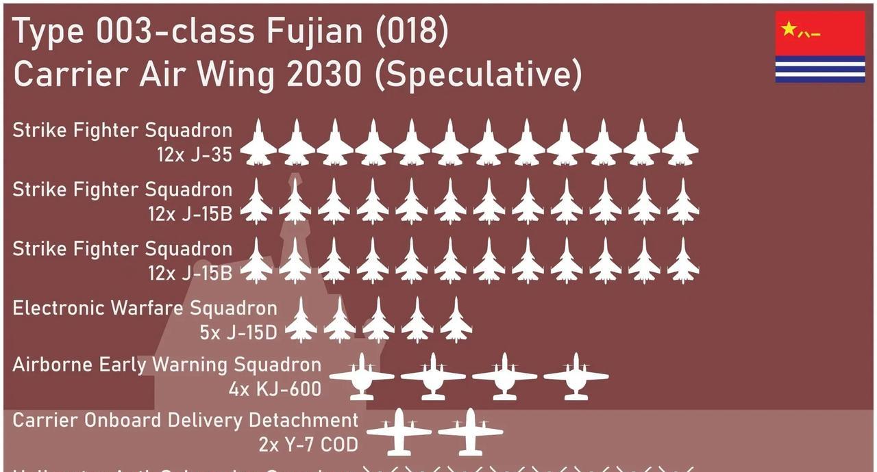 “福建舰”如果将来真的有这个配置,那将会成为最强大的航母,没有之一! 3个攻击机中队,包括 一个歼-35中队:总共12架歼-35隐身战斗机; 2个歼-15B中队,总共24架歼-15B战斗机; 然后还有一个电子战中队,有5架歼-15D;一个预警机中队,有4架空警-600,除此之外还有2架运-7和8架直-20F。 不过感觉歼-15B的数量有点多吧,2个歼-35中队+1个歼-15B中队的配置应该也不过分!