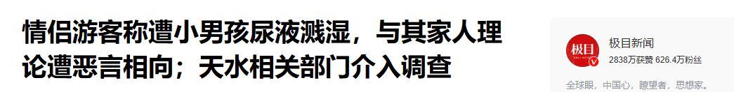 “惯子如杀子!”小情侣去甘肃游玩时,不慎被便利店老板的小孩尿了一身。情侣看孩子小没有过多计较,但希望老板免费给一包湿巾让他们清理一下。可不料,便利店老板听完立马翻脸,还怒骂:“咋没尿你嘴里!”甚至推搡男子,报警后依旧嚣张的不行。 “你孩子朝我们撒尿!做家长的不管管吗?”没想到,男人听到后,居然凶神恶煞道:“咋没尿你嘴里!多管闲事!” 7月15日晚上,一对小情侣在网上投诉,他们在甘肃天水游玩时,被人尿了一身,简直是奇耻大辱。 事发时,男的正在便利店买水,由于无事可做,女友便在路边等着。 就在二人准备离开时,突然感觉身后热热的、湿湿的,扭头一看一男孩正冲着树撒尿,而且还故意提高角度,一些尿溅到了他们身上。 女友撇了一下嘴巴,掏出携带的湿巾赶紧擦掉,男的也差点恶心的吐出来,但孩子却一点道歉的意思都没有,在一旁哈哈看戏。 很快,湿巾就用完了,男的又回到小卖部买纸。 这时候发现,刚才的小男孩竟然是老板的儿子,于是不满道:”看好你的孩子,他大街撒尿,溅我身上了!不管管吗?“ 没想到,店家直接回怼:“咋没尿你嘴里?就你事多?”紧接着,脏话连篇,骂的情侣俩狗血喷头。 男子气的拨打了110,民警抵达后,从中开始调解,结果店家依旧态度嚣张。 此事传到网上,引发了激烈讨论。 人家小两口去乡村度个假,衣服被你家熊孩子弄脏了,要求你管管孩子有错吗?结果瞬间变脸,比川剧变脸还快!开口就是“怎么不弄你脸上”,这不地痞流氓吗! 还有人吐槽,最绝的是警察来了他还一副“我孩子天下第一无辜”的架势,这简直是溺爱的典范,以后到了社会上,有他儿子吃苦的时候。 常言道,娇子如杀子,小伙子因为涉世不深,需要家长的引导。 可若是父母置之不理,或者助长他们的嚣张气焰,就会给孩子一种错觉,做什么都可以,反正有爸妈当后盾。 弄脏衣服只是小事,等再长大一些,就开始打架斗殴,届时再想管已经晚了! 还是那句话,溺爱不是保护伞,而是让孩子丧失社会适应能力的慢性毒药。 养孩子更不是养祖宗,公共场合的底线教育从小就得立!别等孩子闯大祸才哭天抢地,那时候可没人惯着你! 对此,你怎么看?
