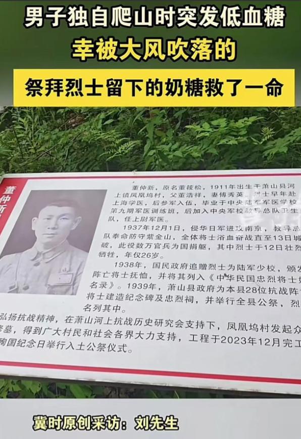 太神奇了!浙江杭州,男子独自爬山时突发低血糖,在烈士墓前休息,意识逐渐模糊,突然一阵风,从烈士墓碑上掉下一颗别人拜祭时留下的奶糖,救了男子一条命。 后来他看清墓碑上的名字,才知道这位 “帮忙” 的烈士是谁,这事儿说出来,连平时不信这些的朋友都愣了半天。 7 月 12 号那天,杭州的山里头挺热的,刘先生早上去菜场,顺路就想爬个山,出门时急着关煤气,兜里啥吃的都没带,走了不到半小时就开始冒冷汗。 他说当时脚像踩在棉花上,眼睛里看东西都是花的,扶着树喘了好几口气,还是觉得天旋地转,就顺着路边的台阶往下挪,没留神走到了一片墓区,腿一软就跪在最前面那块墓碑前,心里就一个念头:“完了,今天要栽在这儿了。” 迷迷糊糊中他听见 “啪嗒” 一声,像是什么东西掉在地上,也没力气抬头看,就伸手在旁边摸,摸到个圆滚滚的东西,包装纸沙沙响,凭着感觉剥开塞嘴里,甜味儿一冲,脑子瞬间清醒了点,这才发现是颗奶糖。 缓过来后他才仔细看墓碑,上面刻着 “董仲新烈士之墓”,底下还有行小字,写着 “1922-1948,军医,救战友牺牲”,刘先生说当时眼泪一下子就下来了,“我低血糖犯了,偏巧倒在一个军医墓前,还偏巧掉下来颗糖,你说这不是缘分是啥?” 旁边守墓的老张师傅说,董烈士的墓前常有人来祭拜,前一天下午还有个老太太来,放下了一碟奶糖,说是烈士生前当军医时,总揣着糖给受伤的小战士吃,“风吹掉颗糖不稀奇,稀奇的是正好掉在他手边,那天风也不大,就那么一下。” 当地街道的王女士回应称,已经联系上刘先生,他想给董烈士墓前换个结实点的供盘,免得以后供品再被风吹掉,“我们也查了下资料,董仲新烈士确实是军医,当年在附近战斗中,为了把受伤的通讯员背到安全地方,被流弹击中的,牺牲时才 26 岁。” 刘先生的邻居赵大姐说,他这人平时不爱说话,那天回来拉着她讲了半个多小时,说得眼泪汪汪的,“他说现在每次路过烈士陵园,都想进去站站,觉得心里踏实,好像有人在护着似的。” 监控录像显示,当天下午 2 点 17 分,刘先生倒在墓碑前,2 点 19 分左右,一阵风吹过,供盘里的奶糖滚落,正好落在他右手边约 30 厘米处,他摸索了大概 20 秒后拿到糖,2 点 25 分左右坐起身,对着墓碑鞠了三个躬。 至于这颗糖到底是巧合还是别的,刘先生自己也说不清楚,“你说巧吧,巧得让人不敢信,你说不是巧合吧,又没啥道理,反正我是信了,是董烈士在帮我。” 现在董烈士的墓前已经换上了新供盘,刘先生每天早上爬山时,都会绕过去看看,有时候带块蛋糕,有时候带瓶水,“就想跟他说声谢谢,虽然他听不见,但我心里踏实。” 目前这事儿也没啥特别的处理结果,街坊们茶余饭后会聊起,有人说就是碰巧,有人说烈士精神不散,刘先生说不管咋说,这颗糖救了他,他记一辈子。 本文信息综合自杭州本地平台公开报道(2025 年 7 月 18 日)