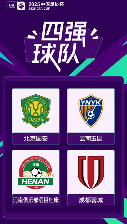 中国足协杯半决赛对阵出炉:北京国安将在主场对阵云南玉昆,成都蓉城将在主场对阵河南