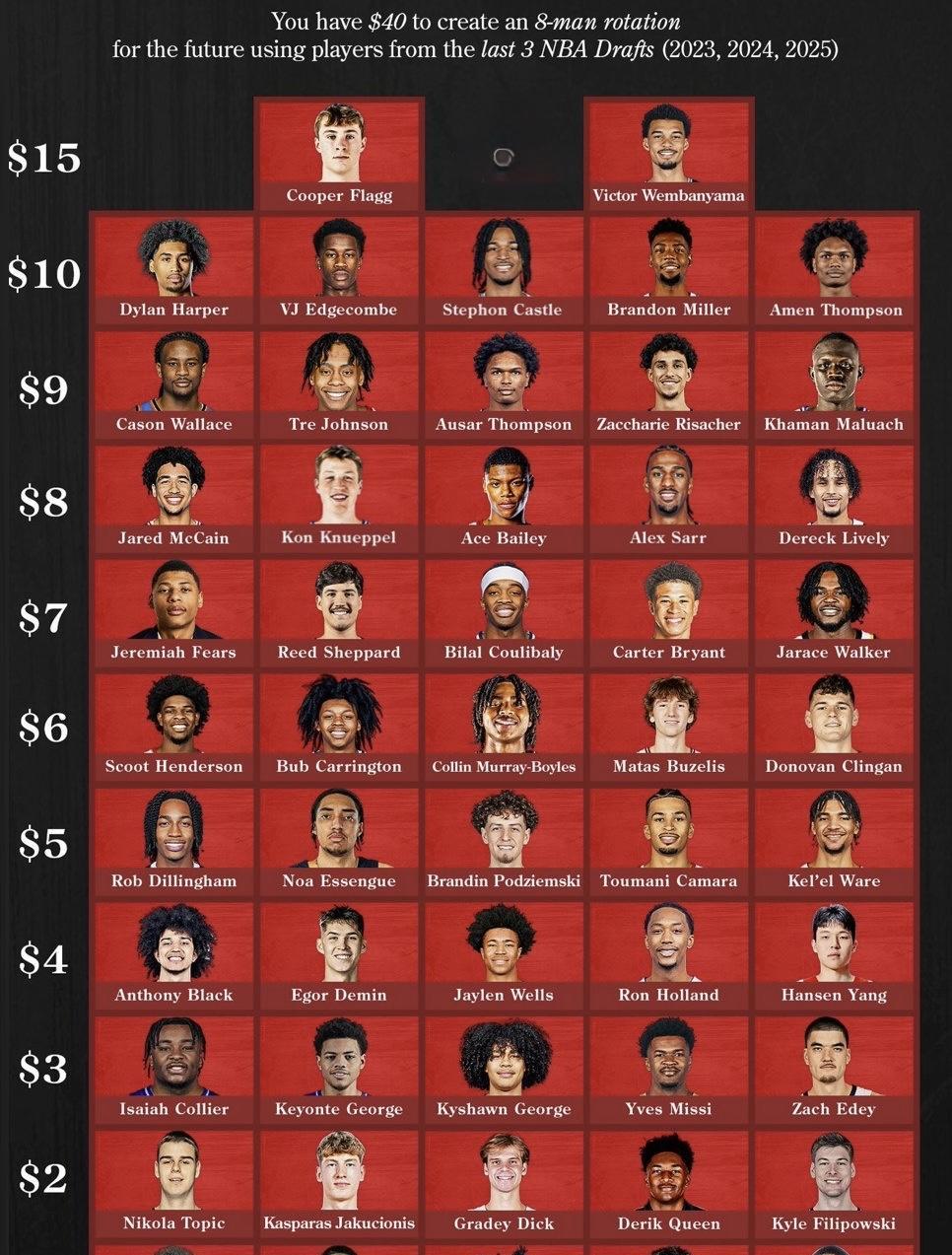 15块钱组球队已经玩腻了吧,现在来了新玩法,40块钱组成一个8人轮换,而且必须是近三年的优质新秀,如果是你,你怎么选? 我来选的话,中锋必须杨瀚森($4),大前锋选择阿门可以空切吃饼($10),小前锋弗拉格($15)做核心,分位凯肖恩乔治($3),控卫沃特克莱顿($1),其中克莱顿绝对是物超所值,这样可以有7块选择3个替补,那么前场必选托马斯索伯($1),可以4/5号位摇摆,后场基扬特乔治($3)也是1/2摇摆,最后一个锋卫摇摆先格雷迪迪克($2),整个薪资距离工资帽还有1块钱。 这套阵容首发场上有4个人可以处理球,可以后卫和中锋打挡拆,也可以锋线持球做选择。而且有了这些替补,还可以排出阿门汤普森,凯肖恩乔治,格雷迪迪克,弗拉格和托马斯索伯的五小阵容疯狂换防。另外,在需要快速推进进攻的时候可以摆上克莱顿,俩乔治的三后卫,基本上可以应付所有突发情况。 如果是你,你会怎么选?