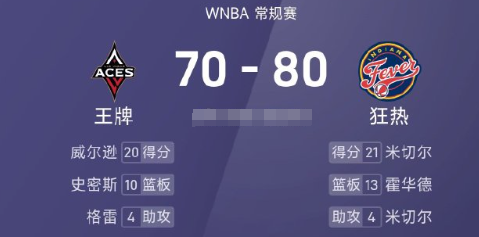 25赛季WNBA 常规赛,狂热对阵王牌。双方全场战罢,狂热80-70战胜王牌。米切尔砍下全场最高的21分1板4助,率领狂热成功取胜。