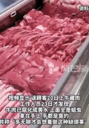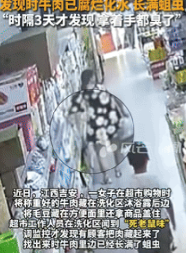 “坏了良心!”江西吉安,一超市员工在洗化区闻到“死老鼠味”,几经寻找,发现在沐浴露后面,藏着一块已经生了蛆的牛肉,员工拿在手里,手都是臭的,为找出是谁在恶作剧,员工调取了监控,不料,视频显示的画面让她大吃一惊,网友:得多无聊才能做出这种缺德事! 据风芒新闻7月24日报道,事情发生在吉安,员工闻到怪味后,就顺着味道来到放置沐浴露的区域,从表面来看,没什么不妥的,总不能是沐浴露散发出来的吧? 为不影响顾客的购物体验,员工将前面摆放的沐浴露全部移开,映入眼帘的就是,一块被称重好的牛肉,员工把肉拿了出来,味道刺鼻,但她还是打开看了眼。 里面不仅有蛆虫在爬行,还有黄水,这一看就知道放了好几天,新鲜牛肉绝对不会是这个样子,而且洗化区的物品不需要冷藏冷冻,把肉放这的人,真是缺大德了。 虽然把牛肉销毁了,但味道还得需要一定时间才能散发掉,为找到罪魁祸首,员工决定看监控视频,结果发现是名女顾客所为,她藏肉的时候,还观察了四周是否有人。 确定没人注意到她后,才敢这么放肆,员工耐着性子往下看,没想到女顾客令人恶心的行为还没完,她把毛豆藏在方便面中,为防止别人一眼看见,还拿东西掩盖住毛豆。 如果称重完不想要,可以放在物品原来的区域,没必要用这样的方式,为难工作人员,况且这样做,压根得不到任何好处。 对于这件事情,大家有什么看法?
