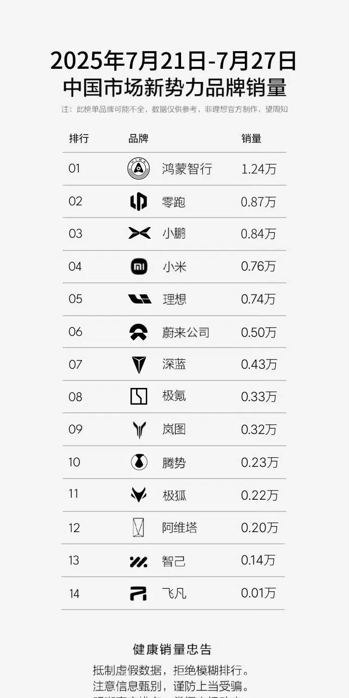 周榜出炉,鸿蒙智行、零跑再次斩获前二! 今天新势力最新周榜放榜了,鸿蒙智行、零跑