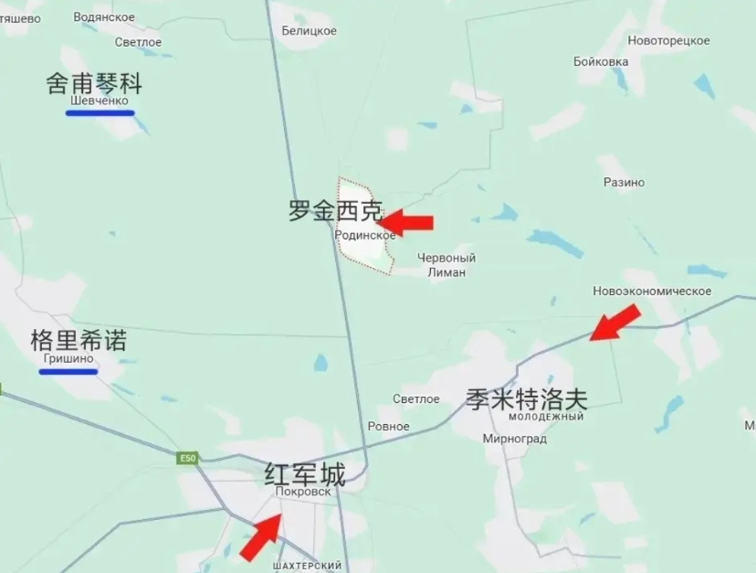 俄军从三方向收紧包围,北线攻占罗金西克东部边缘,西线季米特洛夫,从西南方向突入,乌军开始从罗金西克撤退,这导致附近整体防御体系陷入混乱。