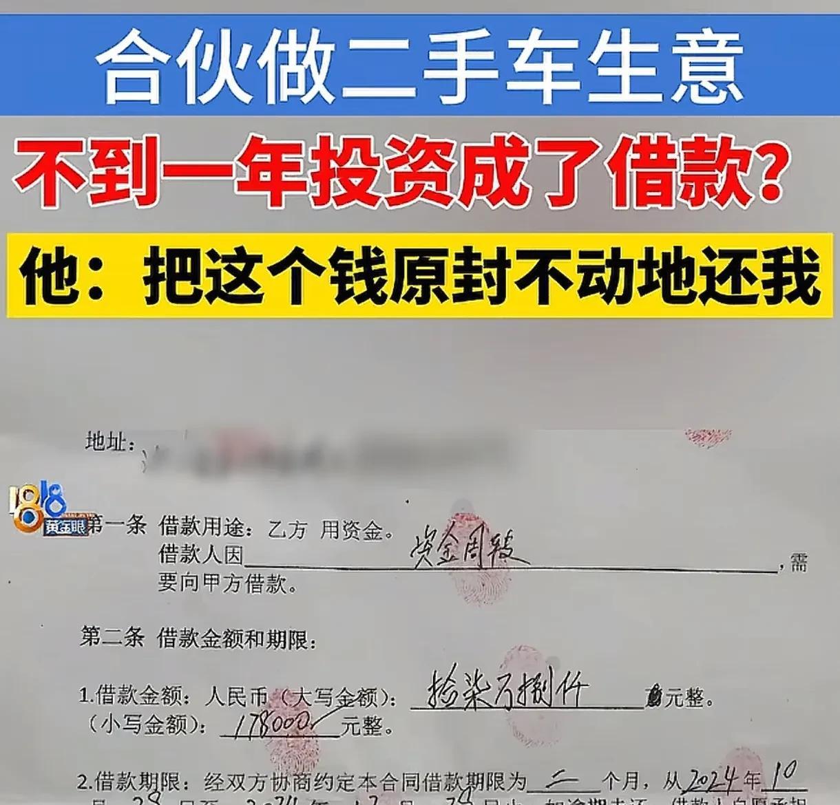 浙江嘉兴,男子认识了一名做二手车生意的老板,对方让他投点钱一起做生意,男子分6成,对方拿4成,男子觉得还不错,分6次投了44.8万元。可过了几个月,对方迟迟没回款,男子感觉不对劲,一查发现对方28万收的车,实际只值6、7万,觉得自己被骗,报了警,可对方却说自己只是找男子借钱做生意,不是说合伙做生意,经调解,对方写了一份借条给男子,承诺把剩余的22.8万借款还给男子,可结果让他始料未及。 8月6日1818黄金眼报道,王先生是从事装修行业的,2024年9月,在一次朋友饭局上,他结识了一名姓陈的老板,对方是做二手车生意的。 两人认识之后,王先生经常去陈老板店里喝茶,在闲聊时,陈老板问他有没有兴趣做二手车押车,叫他投点钱进去。 王先生有些犹豫,可对方却说自己是做实体的,不会骗人的。 两人口头约定,王先生不参与具体的经营事务,每个月就等着分钱就行,利润分配上王先生占六成,陈老板占四成。 2024年10月13日,王先生给陈老板转了5万元,算是第一笔投资款,同年次月,陈老板给王先生转来3000元,说是分红。 有了第一笔利润分红,王先生对陈老板更加信任了,之后他又给对方转了5笔钱,前前后后总共投入了448000元。 在这期间,陈老板也陆陆续续给王先生转回来15万左右,两人之间一直没有签合同,只是口头约定。 可到了2025年4月,王先生发现有些不对劲了,陈老板之前承诺的回款迟迟没有到账,他这才开始着急起来,决定好好查查这件事。 他想起2024年11月6日,陈老板给他发过一张保时捷车子的照片,说去收这辆车花了28万,两人各投14万,王先生当时也没多想,可这次他到网上一查,结果让他大吃一惊,这辆车竟然只值6、7万元。 王先生这才意识到自己可能被骗了,而且其他的车子他连影子都没看到,要是看到了,说不定就不会上这个当了。 王先生又气又急,赶紧报了警,警察介入后,双方进行了调解。 陈老板说自己没有骗王先生,两人也没有合伙做生意,自己只不过是借了王先生的钱拿去做生意,这44.8万元是借款,并且自己陆陆续续还了10多万了。 7月22日,双方又签了一份调解协议,协议约定:陈老板以合伙买卖二手车为由,向王先生分6次借款44.8万元,已经还款159200元,目前还剩28.8万元没有还清,并且还约定了分期还款的时间。 王先生以为这下总算有了个说法,钱应该能慢慢要回来了。 可没想到,陈老板根本没有履行协议内容,按照约定,7月31日,陈老板就应该还一笔款给王先生,可他并没有还。 并且协议里还约定了,陈老板要把房产证抵押给王先生,他也没有兑现这个承诺。 更让王先生绝望的是,陈老板的门店居然关门了,无奈之下,他只好找来了记者。 陈老板跟记者说,自己只是跟王先生借钱做生意,不是合作做生意,还强调打了欠条给王先生了。 他说最近生意不好,店一直没开,欠王先生的钱自己一直在凑,等凑好了就会给他。 至于房产证,他说给王先生也没用,因为自己正在卖房子凑钱。 按照协议,陈老板要在9月30日之前还清借款,王先生无奈地表示,自己只能再等一等了。 王先生出于对朋友的信任,在陈老板的劝说下进行了投资,他本来想着这笔投资能带来一些额外的收益,谁知道最后却变成了陈老板口中的借款。 《民法典》第967条规定:合伙合同是两个以上合伙人为了共同的事业目的,订立的共享利益、共担风险的协议。 王先生和陈老板从一开始就没有签订合伙合同,两人仅仅只是口头约定,说投点钱,一起做生意,如王先生拿不出合伙做生意的相应的证据,仅凭转账记录,是不能证明双方存在合伙合同的。 因此,跟他人做生意,一定要白纸黑字的把合作内容写清楚,并签字按捺,以免后期出现纠纷,有据可依。 经过调解,陈老板承认自己找王先生借款44.8万,已还款15万多,还剩下28.8万没还清,双方之间构成借贷关系。 《民法典》第667条规定:借款合同是借款人向贷款人借款,到期返还借款并支付利息的合同。 王先生可以要求陈老板按时还款,双方签署的调解协议是合法有效的,如对方到期未还,王先生可以将对方诉至法院,由法院判决后,可申请强制执行,以此维护自己的合法权益。 关注@律觀法说 ,从法律角度看世界,感受不一样的人情冷暖。 #头号创作者激励计划#
