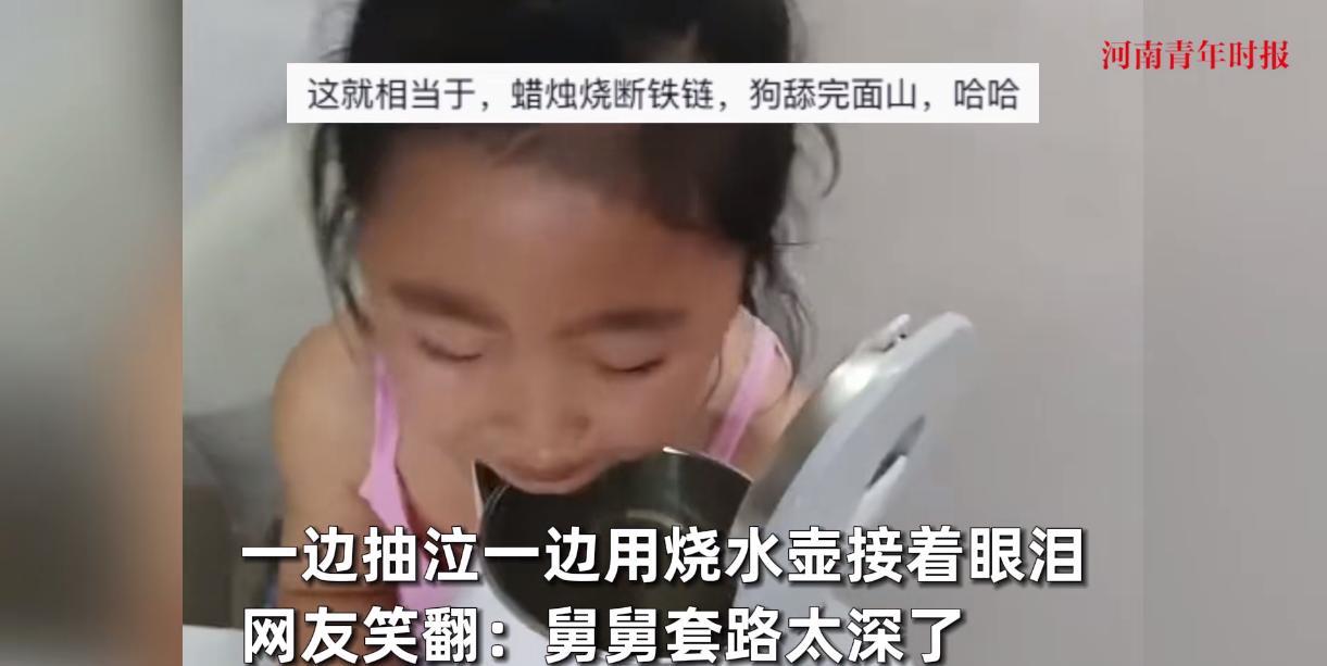 “人怎么能这么聪明!”近日,甘肃,一小女孩因为不想写作业,被舅舅灵机一动,想出了一个绝妙的办法,他找来一个热水壶,让外甥女把眼泪哭满热水壶之后,就可以不写作业了,谁知女孩竟然真的“大哭”起来,网友:这辈子的伤心事都想完了! 对于小孩子来说,最难过的事情莫过于上学和写作业了,尤其是那些学习成绩不太好的孩子,看到写作业更是头疼的不行, 这也让家长一起跟着受罪。 一位外甥女趁着暑假到舅舅家里玩,前几天的时候都还很开心,可是当小女孩听到自己要写作业的时候,顿时就崩溃了。 她一边哭一边偷偷看舅舅,想着能让舅舅“放过她”,不让她写作业了,可舅舅这也是为了外甥女的学习着想,他最后无奈想出了一个办法,那就是让小女孩哭个够。 他找来了一个烧热水用的热水壶,然后给了外甥女,表示只要她能把这个热水壶给哭满,就可以不用写作业了,本以为小女孩会知难而退,没想到她却真的打算把热水壶用泪水填满。 她用自己的“影帝级”哭戏证明了,只要不让小孩子写作业,不管让他们干什么都行,可不管她怎么哭,热水壶里的眼泪肯定是不可能哭的满的! 网友看到这一幕纷纷调侃,为了不浪费眼泪,还特地抱着热水壶在怀里,生怕有的眼泪没有滴进去,可惜这和蜡烛烧断铁链、小狗舔完面山没有任何区别,想要哭满热水壶几乎是不可能的! 信息来源:《舅舅说哭满水壶可以不写作业,女孩立马上演“影帝级”哭戏!网友笑翻:套路太深了》半岛晨报