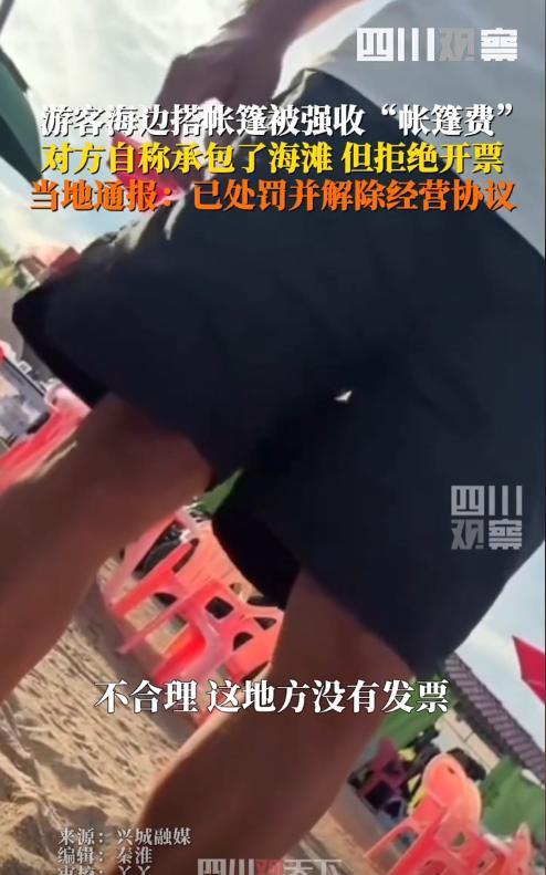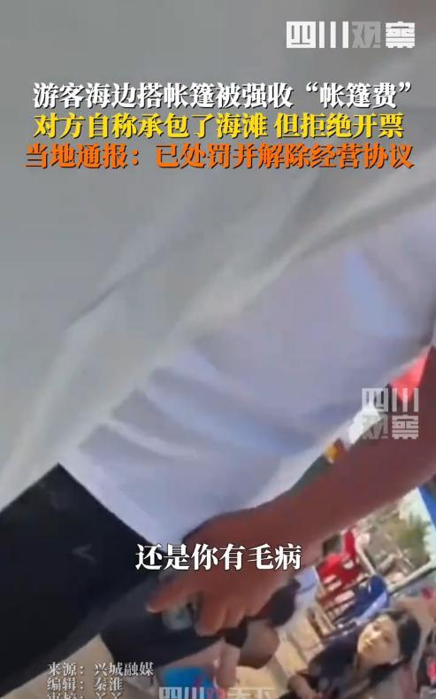 “严查到底!”8月7日,辽宁葫芦岛,一女子在海滩边搭帐篷,却被工作人员过来收50元的“沙滩费”,不给就不让搭帐篷!女子从没遇到过这种情况,和对方理论一番,并要求开发票,没想到,工作人员却说:有毛病,这地方没发票。网友:海滩啥时候变成私人的了? 如今正值旅游旺季,不少市民会利用周末时间到周边自驾游一下,虽然周末的人相对较多,但呼吸呼吸新鲜的空气确实能让身体放松不少。 立秋这天,女子和朋友一起开车来到海滩游玩,众人搭好帐篷后,突然,一名工作人员拿着收款码走了过来,张口就问她们要“沙滩费”。 女子从来没有听说过这种收费,就和对方理论起来,没想到工作人员态度恶劣,表示这片沙滩被他承包了,收费规则都是他定的,不付钱的话就离开。 女子便要求对方给自己开发票,结果又被“教育”了一番:“一万个人就你一个人要发票,谁有毛病?”“要发票不合理,这地方没发票。” 女子虽然生气,但最终还是付了钱。 第二天,女子将视频发到了网上,引起当地有关部门的关注,经过调查,该沙滩确实承包给了个人,但是收费并不合理,将对其进行处罚并解除经营协议。 网友看后表示,如果所有的东西都能被承包,那岂不是以后连空气都得收费了? 大家对于这件事是怎么看? 信息来源:《辽宁兴城通报“女子海滩被强行收费”事件!》东北新闻网