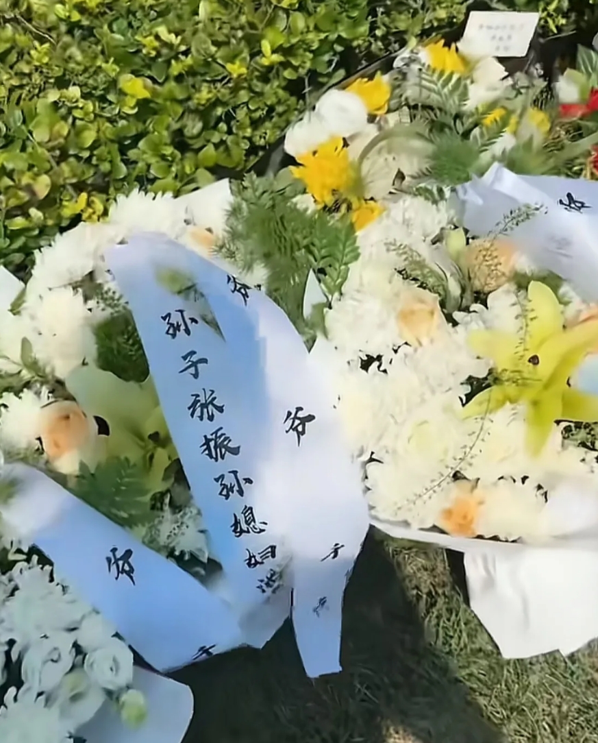 杨议兄弟四人全部到场,子孙后代基本无一缺席,现场人很多,准备了丰盛的水果、糕点祭品,还有一排的白菊花篮,墓碑上放了3条中华烟,对于一个往生的人来说,这祭品的规格,真不可谓不排面啊。