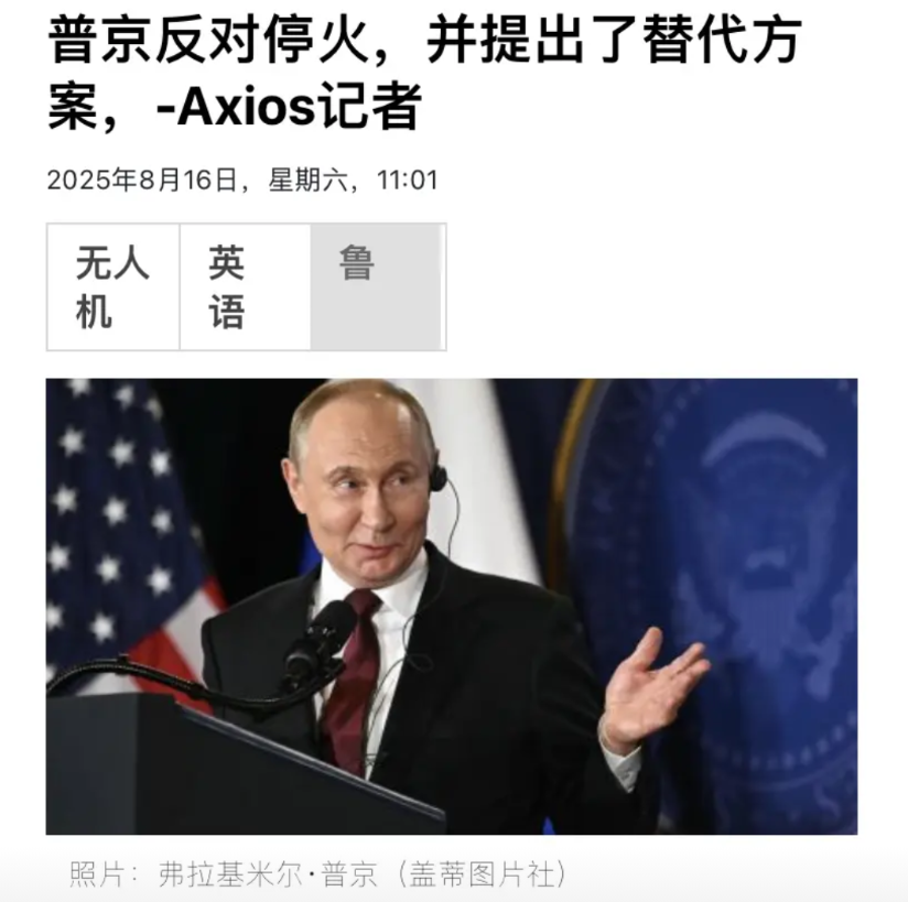 特朗普对普京说让他停火,而普京反对,同时提了一个建议,要签署一项结束战争的全面协议。特朗普似乎认可了这个提议。给泽连斯基的电话中说,快速签署和平协议比停火要好。但目前外界都不知道,普京提议的具体内容。