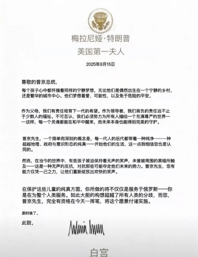 这是特朗普夫人梅拉尼娅写给普京一封信,特朗普在阿拉斯加亲手交给了特朗普。 啥也不说了,上原文。 大家有啥想说的?