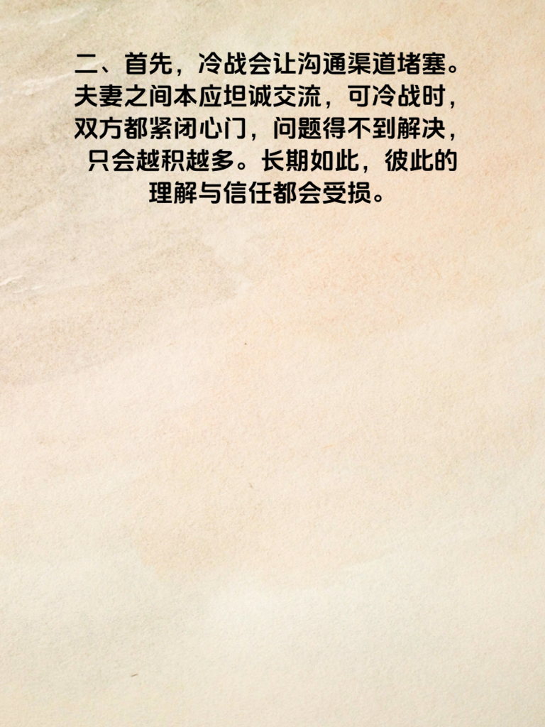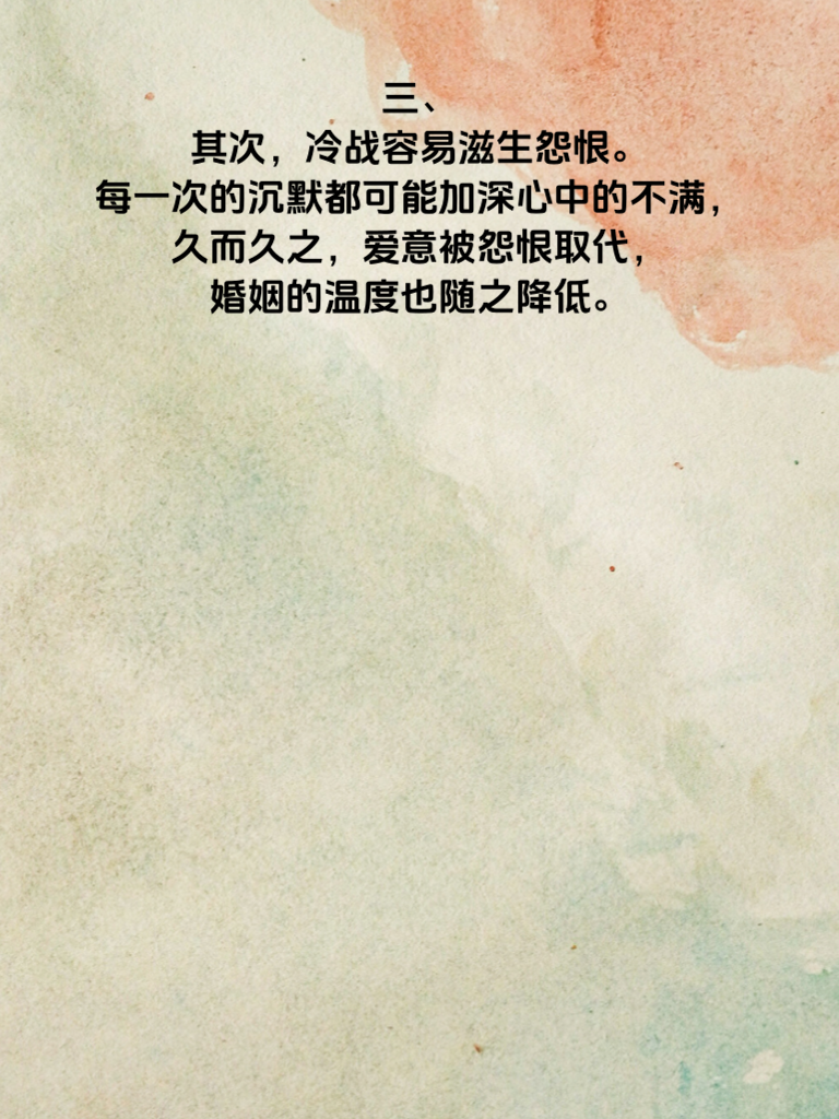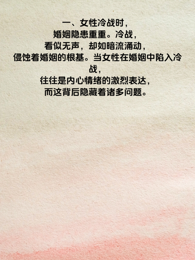 一、女性冷战时,婚姻隐患重重。冷战,看似无声,却如暗流涌动,侵蚀着婚姻的根基。当女性在婚姻中陷入冷战,往往是内心情绪的激烈表达,而这背后隐藏着诸多问题。 二、首先,冷战会让沟通渠道堵塞。夫妻之间本应坦诚交流,可冷战时双方都紧闭心门,问题得不到解决,只会越积越多。长期如此,彼此的理解与信任都会受损。 三、其次,冷战容易滋生怨恨。每一次的沉默都可能加深心中的不满,久而久之,爱意被怨恨取代,婚姻的温度也随之降低。 四、再者,冷战会破坏家庭氛围。孩子在这样压抑的环境中成长,也会受到负面影响。家庭不再是温暖港湾,而成了让人窒息的牢笼。 五、面对女性冷战,男生要及时察觉。主动打破僵局,真诚沟通,倾听她的心声。用爱化解冷漠,让婚姻重回正轨,避免这些隐患演变成无法挽回的悲剧。
