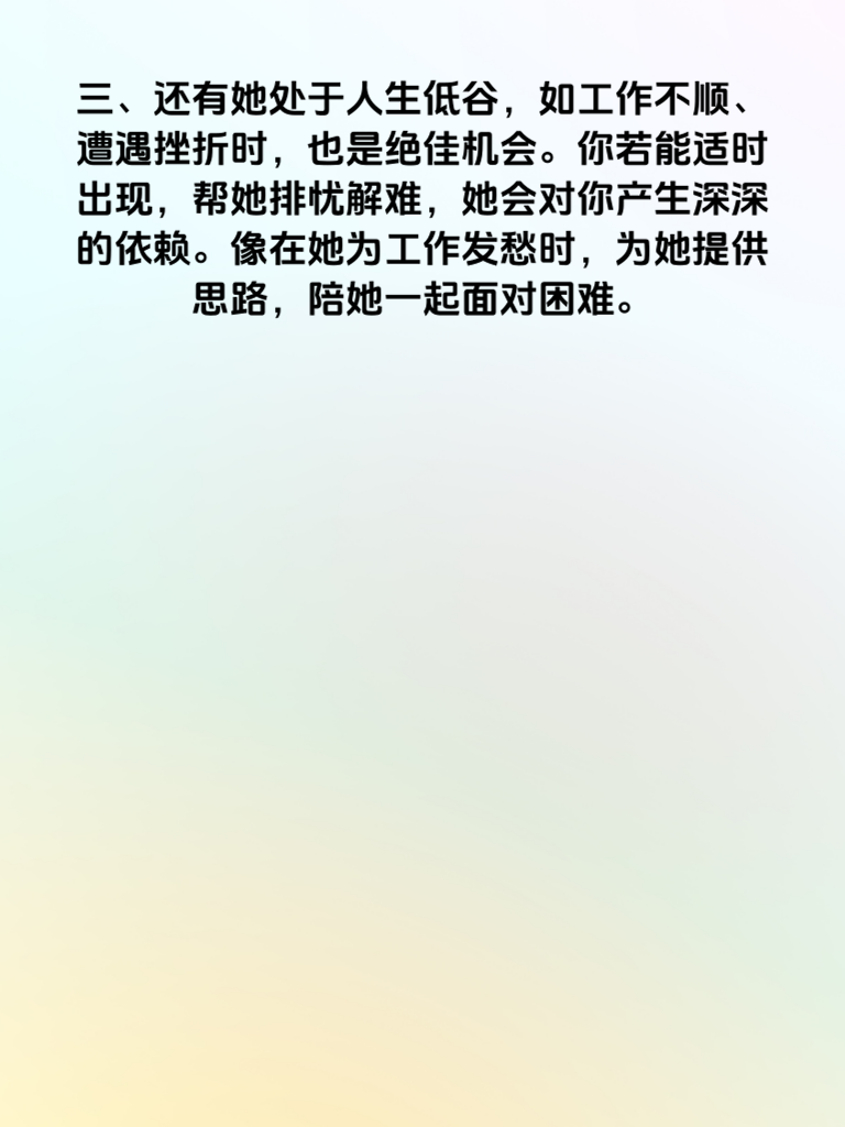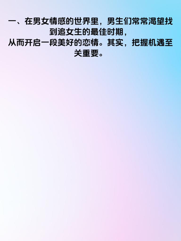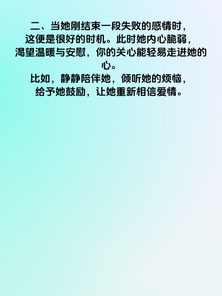一、在男女情感的世界里,男生们常常渴望找到追女生的最佳时期,从而开启一段美好的恋情。其实,把握机遇至关重要。 二、当她刚结束一段失败的感情时,这便是很好的时机。此时她内心脆弱,渴望温暖与安慰,你的关心能轻易走进她的心。比如,静静陪伴她,倾听她的烦恼,给予她鼓励,让她重新相信爱情。 三、还有她处于人生低谷,如工作不顺、遭遇挫折时,也是绝佳机会。你若能适时出现,帮她排忧解难,她会对你产生深深的依赖。像在她为工作发愁时,为她提供思路,陪她一起面对困难。 四、再者,她对你开始表现出特别关注时,这是明显的信号。她可能会主动找你聊天,对你的事情感兴趣。这时你要积极回应,展现你的魅力,让她更坚定对你的好感。 五、总之,追女生的最佳时期需要细心去发现和把握。抓住这些时机,用真心和行动去追求,就能收获美好的爱情。