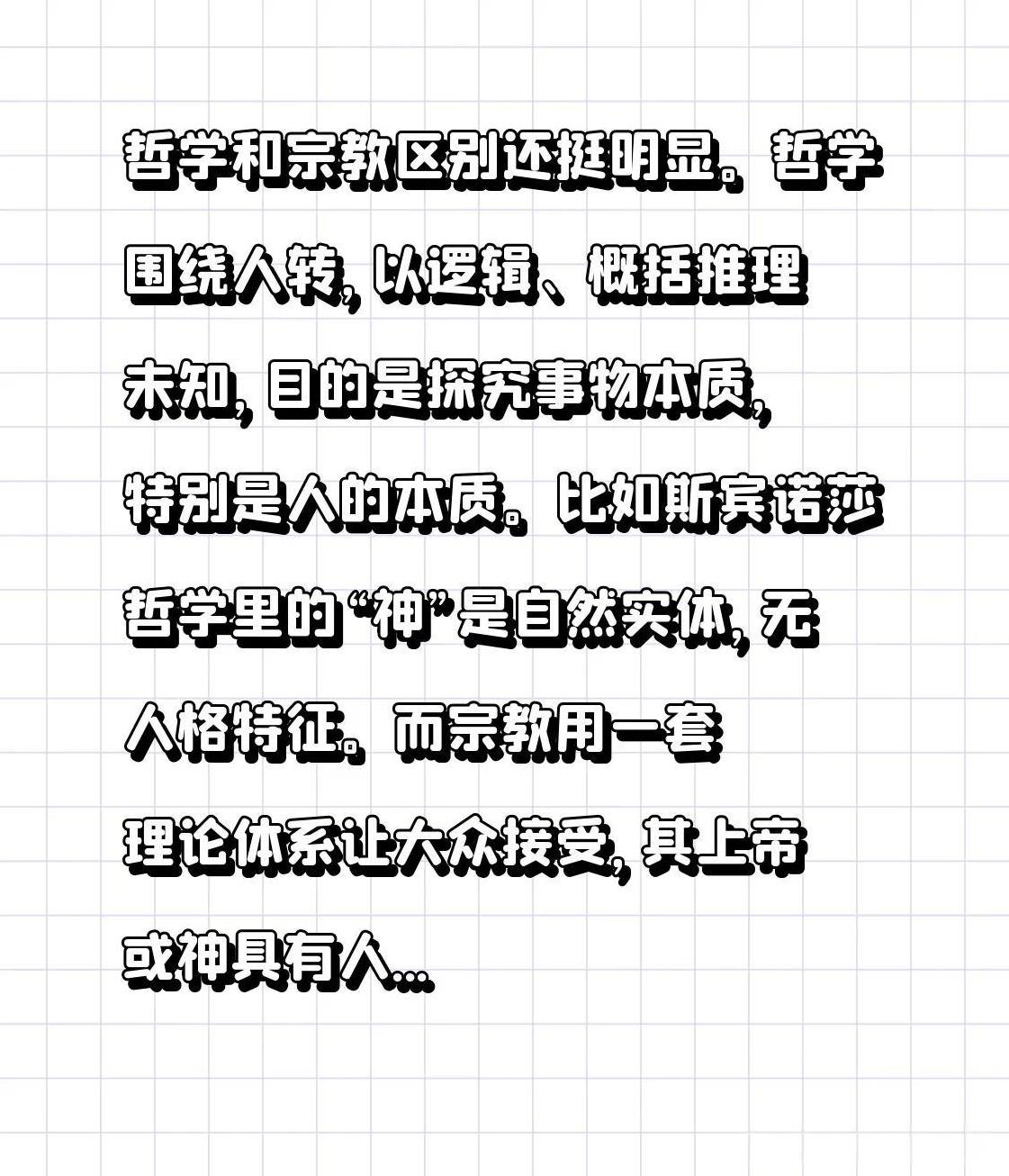 哲学和宗教区别还挺明显。哲学围绕人转,以逻辑、概括推理未知,目的是探究事物本质,特别是人的本质。比如斯宾诺莎哲学里的“神”是自然实体,无人格特征。 而宗教用一套理论体系让大众接受,其上帝或神具有人格特质,像犹太教中神是超验、高于自然世界的存在,是通过神灵启示来告知人无法知道的事。二者都是认识世界、认识自我的方式,但方法和侧重点不同。