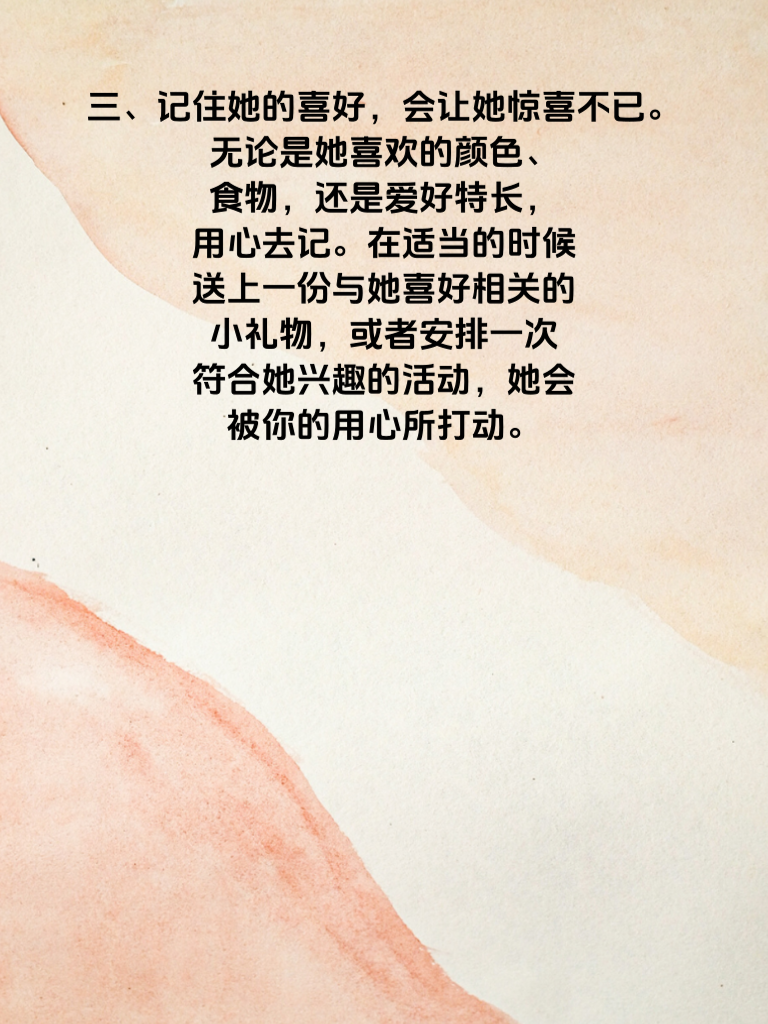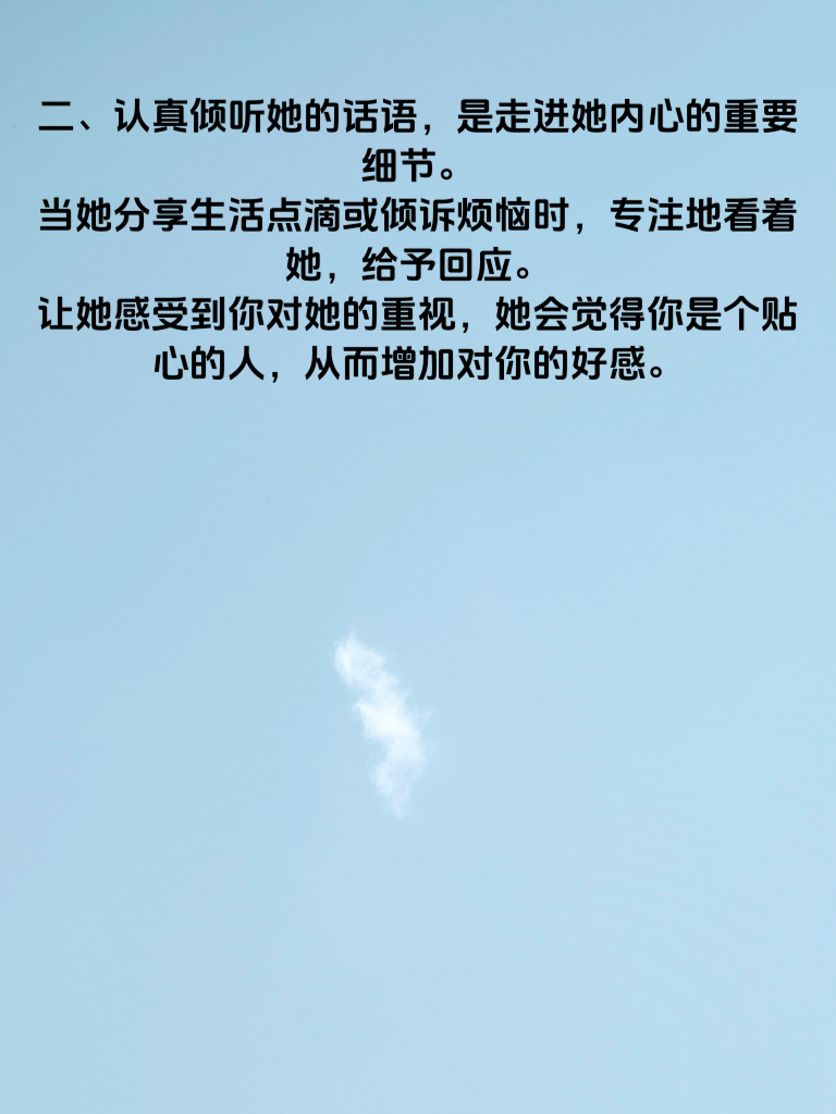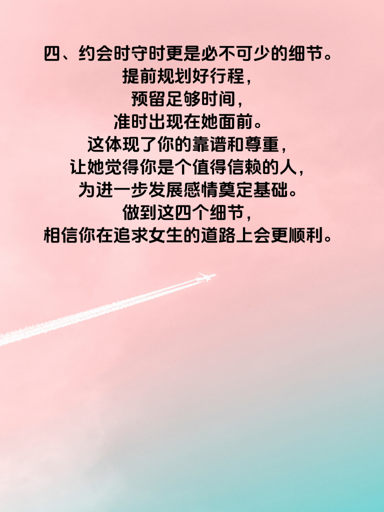 一、细节决定成败,追求女生亦是如此。在与女生相处时,注意仪表整洁是关键的第一步。干净利落的外表会给她留下良好的第一印象。得体的着装,清爽的发型,能展现你的精神风貌,让她更愿意接近你。 二、认真倾听她的话语,是走进她内心的重要细节。当她分享生活点滴或倾诉烦恼时,专注地看着她,给予回应。让她感受到你对她的重视,她会觉得你是个贴心的人,从而增加对你的好感。 三、记住她的喜好,会让她惊喜不已。无论是她喜欢的颜色、食物,还是爱好特长,用心去记。在适当的时候送上一份与她喜好相关的小礼物,或者安排一次符合她兴趣的活动,她会被你的用心所打动。 四、约会时守时更是必不可少的细节。提前规划好行程,预留足够时间,准时出现在她面前。这体现了你的靠谱和尊重,让她觉得你是个值得信赖的人,为进一步发展感情奠定基础。做到这四个细节,相信你在追求女生的道路上会更顺利。