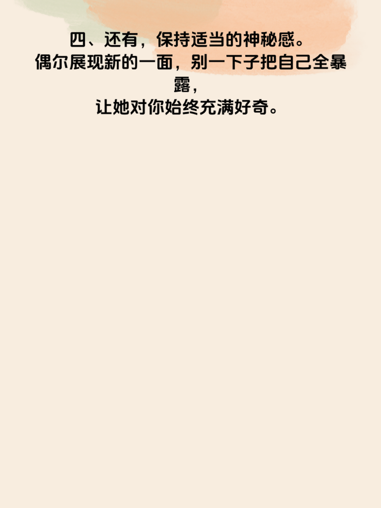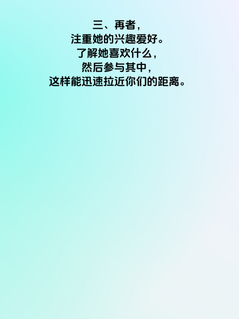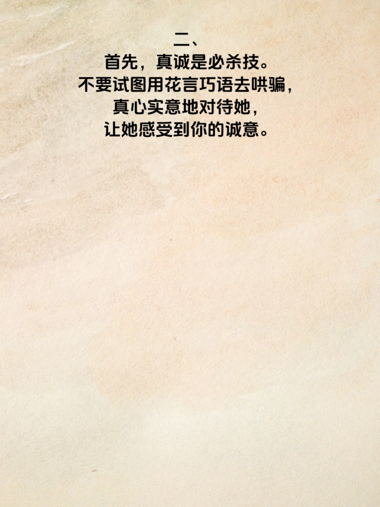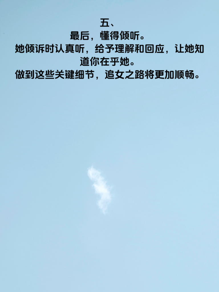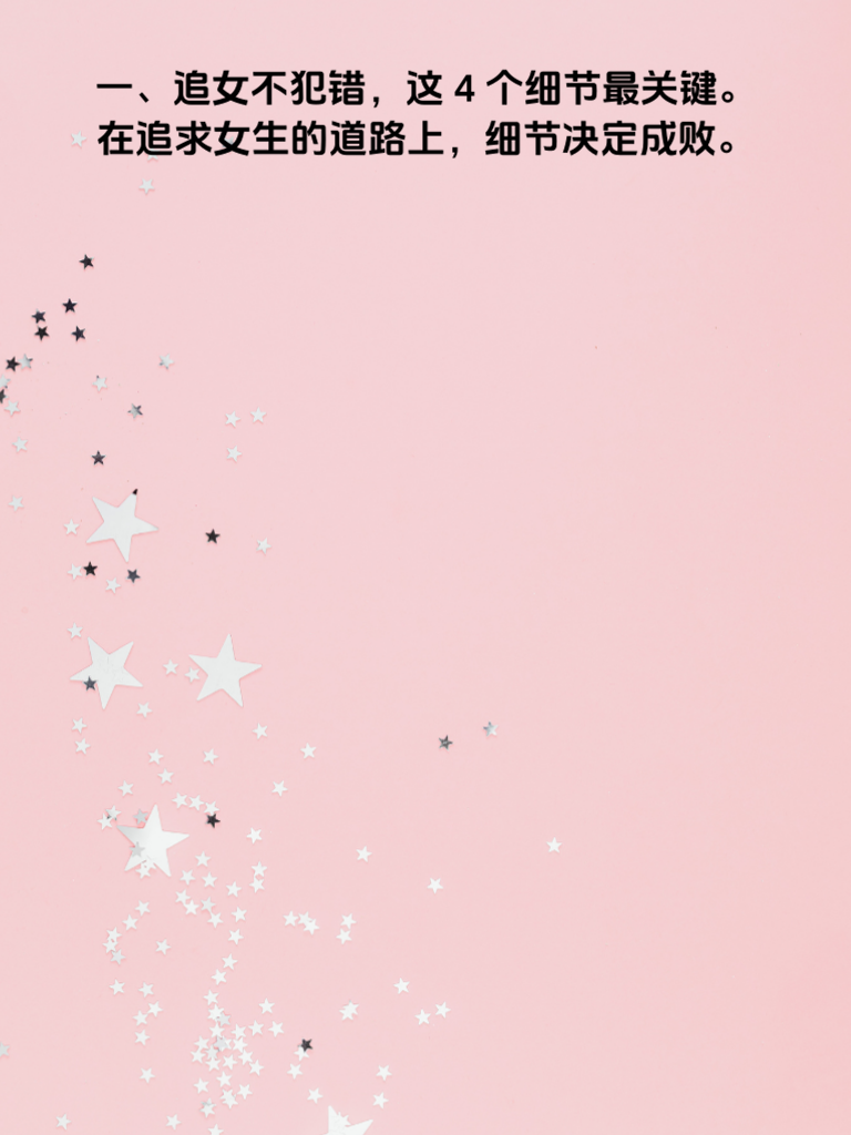 一、追女不犯错,这4个细节最关键。在追求女生的道路上,细节决定成败。 二、首先,真诚是必杀技。不要试图用花言巧语去哄骗,真心实意地对待她,让她感受到你的诚意。 三、再者,注重她的兴趣爱好。了解她喜欢什么,然后参与其中,这样能迅速拉近你们的距离。 四、还有,保持适当的神秘感。偶尔展现新的一面,别一下子把自己全暴露,让她对你始终充满好奇。 五、最后,懂得倾听。她倾诉时认真听,给予理解和回应,让她知道你在乎她。做到这些关键细节,追女之路将更加顺畅。