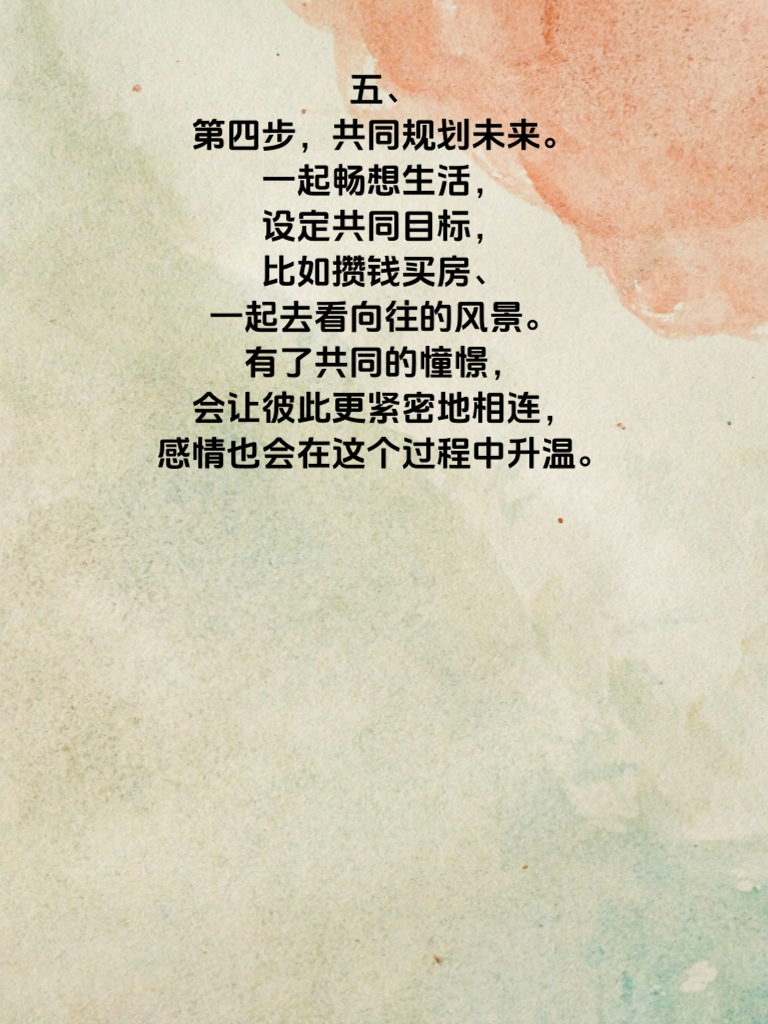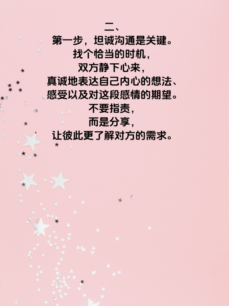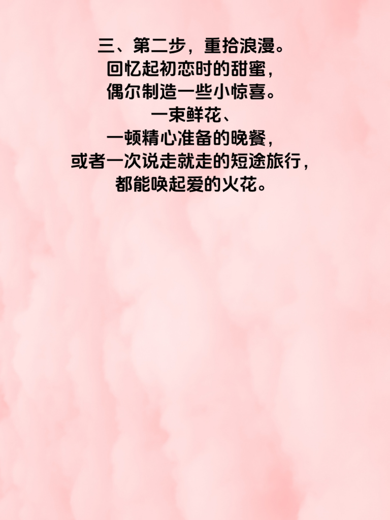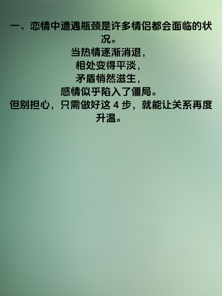 一、恋情中遭遇瓶颈是许多情侣都会面临的状况。当热情逐渐消退,相处变得平淡,矛盾悄然滋生,感情似乎陷入了僵局。但别担心,只需做好这4步,就能让关系再度升温。 二、第一步,坦诚沟通是关键。找个恰当的时机,双方静下心来,真诚地表达自己内心的想法、感受以及对这段感情的期望。不要指责,而是分享,让彼此更了解对方的需求。 三、第二步,重拾浪漫。回忆起初恋时的甜蜜,偶尔制造一些小惊喜。一束鲜花、一顿精心准备的晚餐,或者一次说走就走的短途旅行,都能唤起爱的火花。 四、第三步,给予彼此空间。每个人都需要有自己的生活圈子和个人爱好,不要过度束缚对方。让对方感受到你对他自由的尊重,反而会让他更眷恋这段感情。 五、第四步,共同规划未来。一起畅想生活,设定共同目标,比如攒钱买房、一起去看向往的风景。有了共同的憧憬,会让彼此更紧密地相连,感情也会在这个过程中升温。