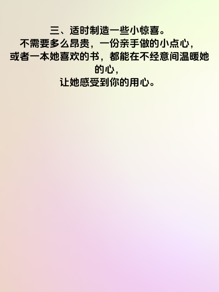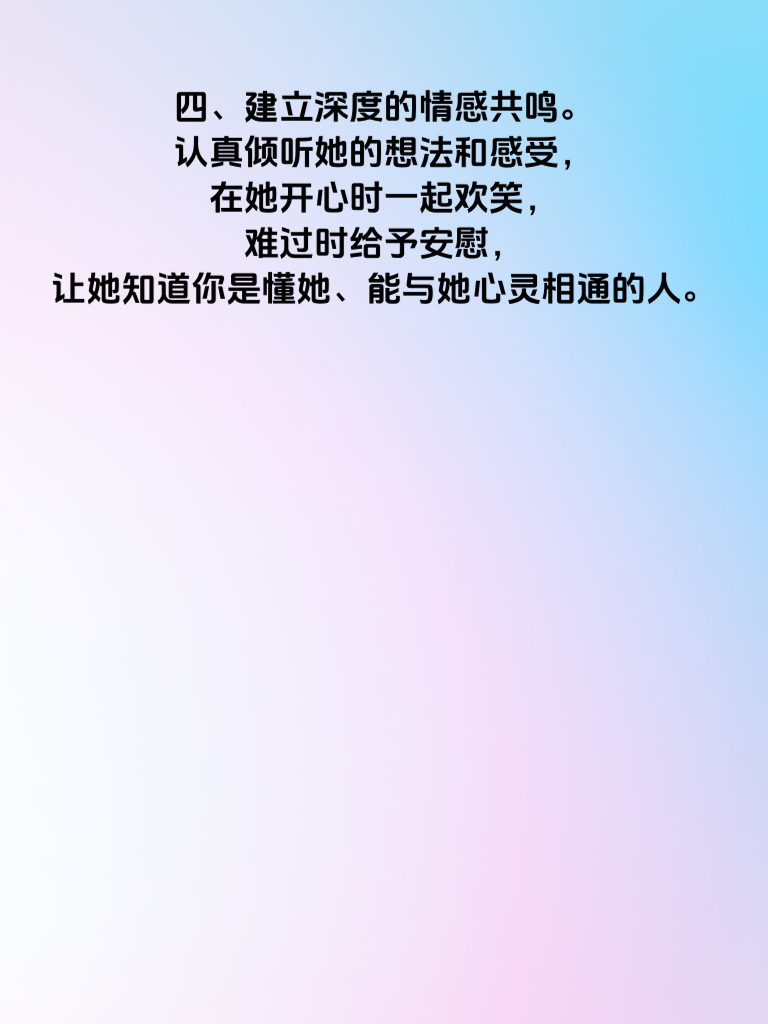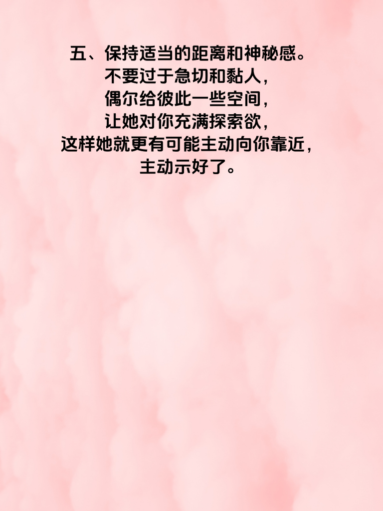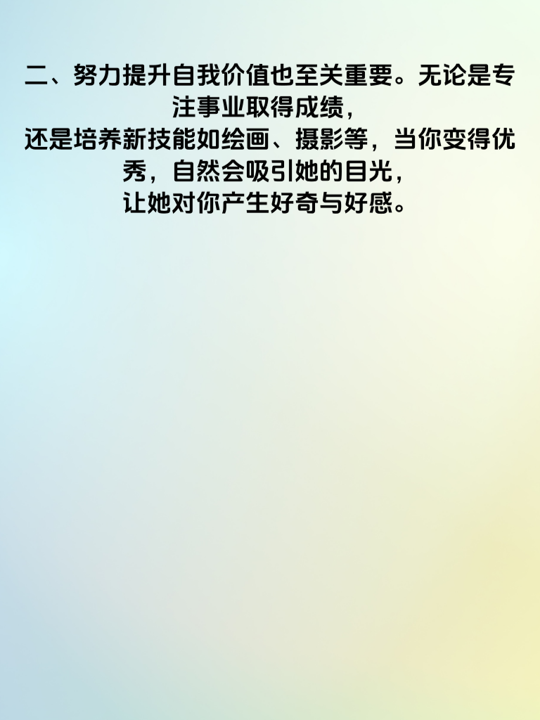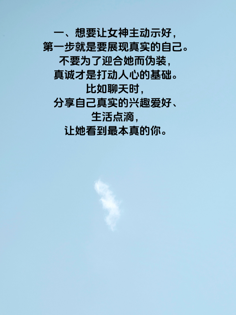 一、想要让女神主动示好,第一步就是要展现真实的自己。不要为了迎合她而伪装,真诚才是打动人心的基础。比如聊天时,分享自己真实的兴趣爱好、生活点滴,让她看到最本真的你。 二、努力提升自我价值也至关重要。无论是专注事业取得成绩,还是培养新技能如绘画、摄影等,当你变得优秀,自然会吸引她的目光,让她对你产生好奇与好感。 三、适时制造一些小惊喜。不需要多么昂贵,一份亲手做的小点心,或者一本她喜欢的书,都能在不经意间温暖她的心,让她感受到你的用心。 四、建立深度的情感共鸣。认真倾听她的想法和感受,在她开心时一起欢笑,难过时给予安慰,让她知道你是懂她、能与她心灵相通的人。 五、保持适当的距离和神秘感。不要过于急切和黏人,偶尔给彼此一些空间,让她对你充满探索欲,这样她就更有可能主动向你靠近,主动示好了。