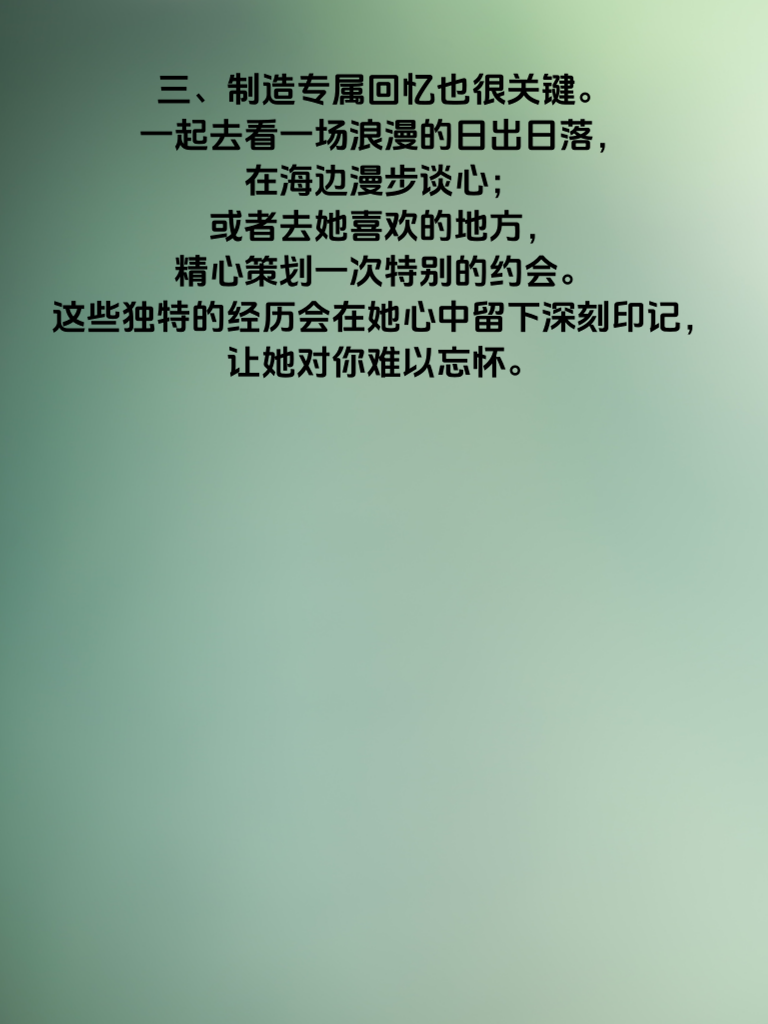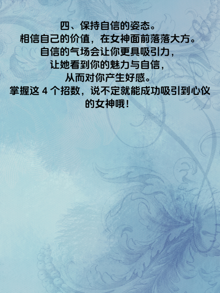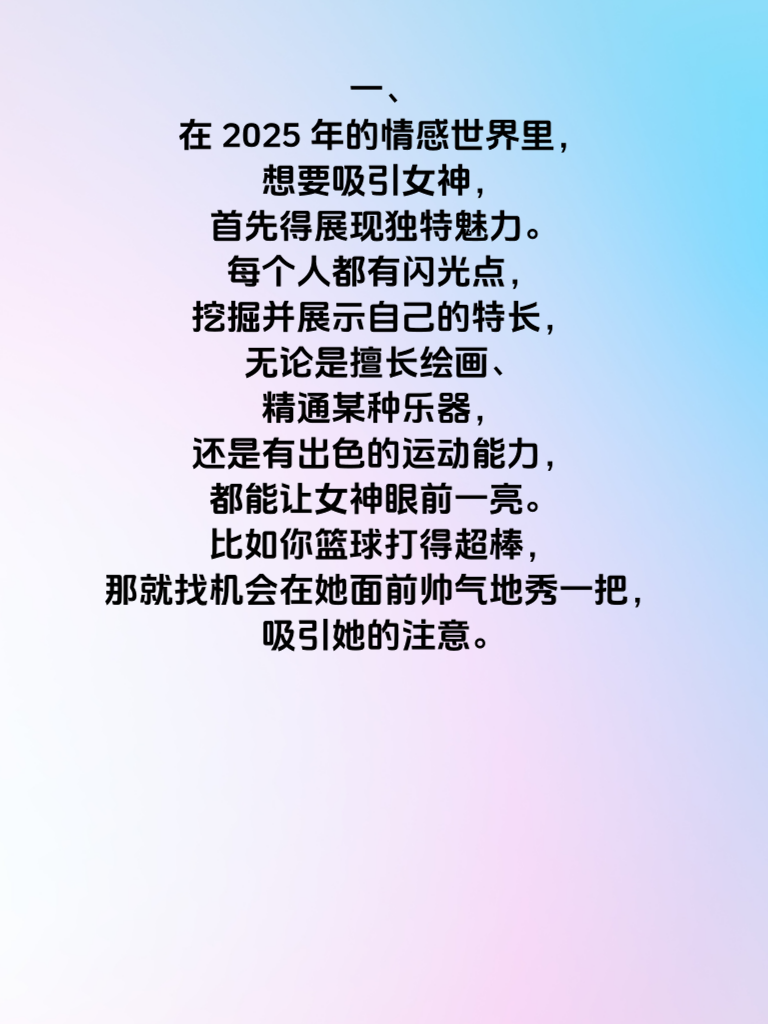 一、在2025年的情感世界里,想要吸引女神,首先得展现独特魅力。每个人都有闪光点,挖掘并展示自己的特长,无论是擅长绘画、精通某种乐器,还是有出色的运动能力,都能让女神眼前一亮。比如你篮球打得超棒,那就找机会在她面前帅气地秀一把,吸引她的注意。 二、真诚是必杀技。对女神要真心相待,不玩虚的。关心她的生活点滴,她生病时送上贴心问候和温暖的药,她遇到困难时全力帮她解决。用真诚去打动她,让她感受到你是可以依靠的人。 三、制造专属回忆也很关键。一起去看一场浪漫的日出日落,在海边漫步谈心;或者去她喜欢的地方,精心策划一次特别的约会。这些独特的经历会在她心中留下深刻印记,让她对你难以忘怀。 四、保持自信的姿态。相信自己的价值,在女神面前落落大方。自信的气场会让你更具吸引力,让她看到你的魅力与自信,从而对你产生好感。掌握这4个招数,说不定就能成功吸引到心仪的女神哦!