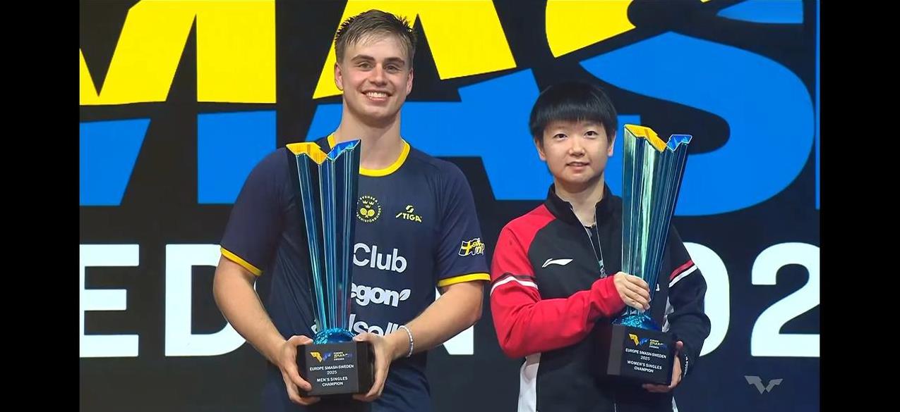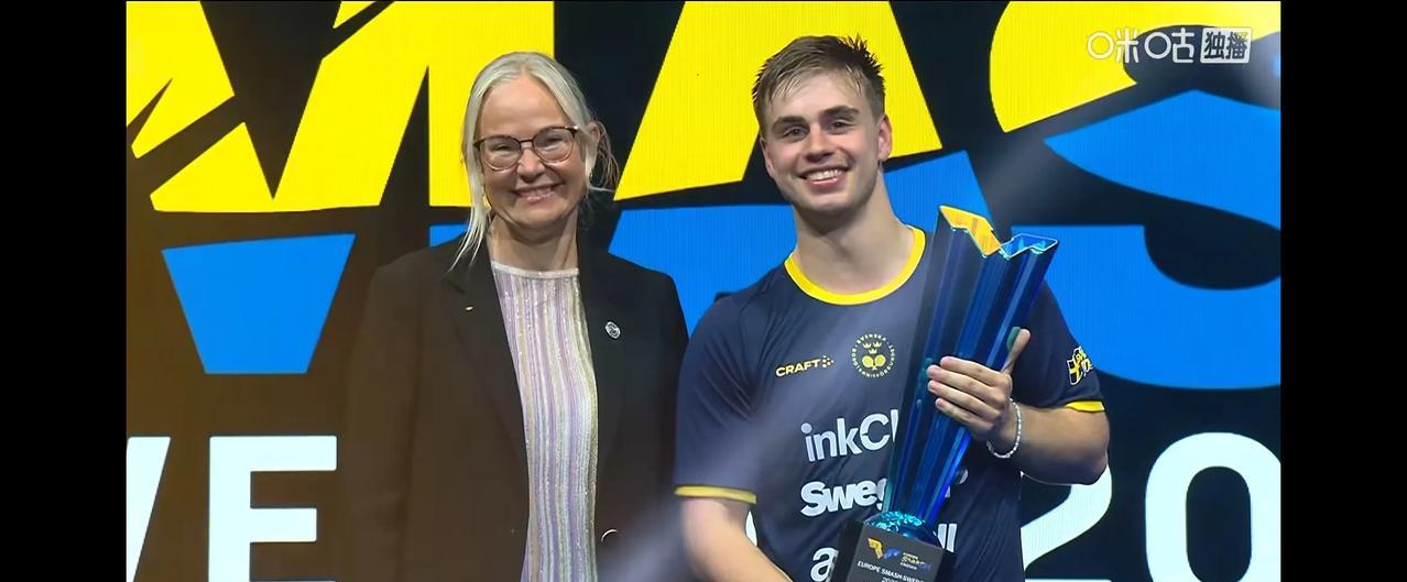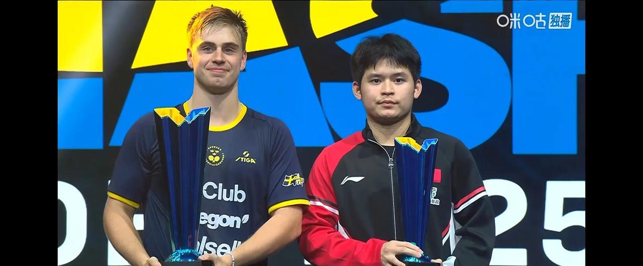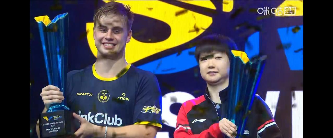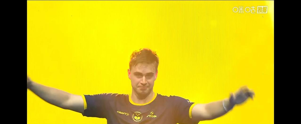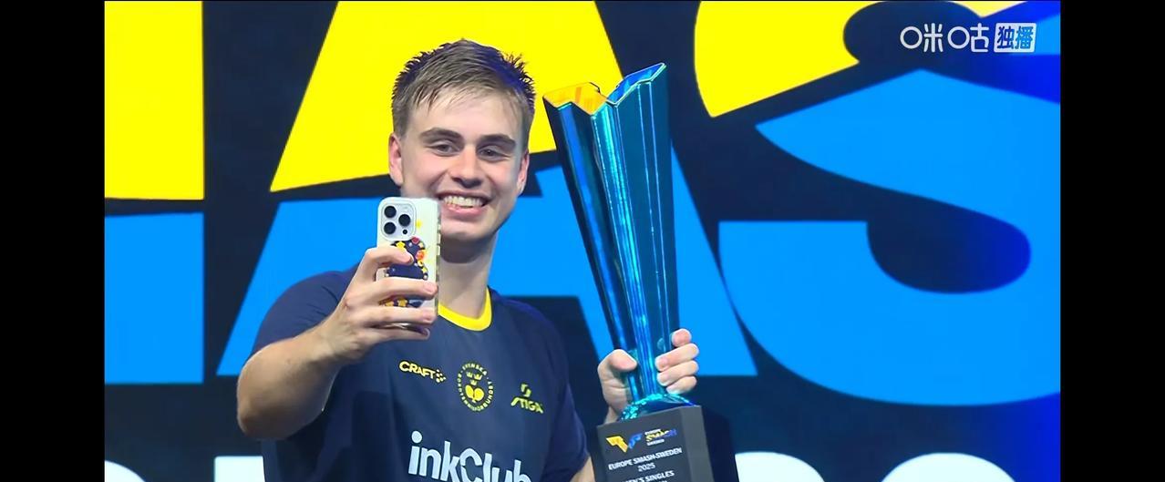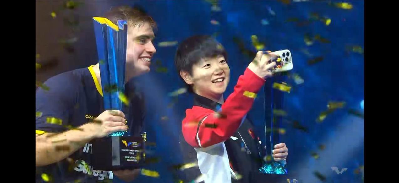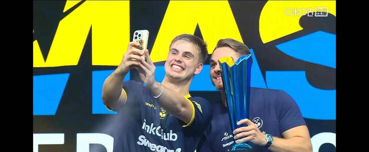 颁奖仪式。 瑞典大满贯男单冠军:瑞 典队莫雷加德。 亚军:中 国队,林诗栋。 小莫笑的很开心。 女单冠军莎莎上来一起合照时,莎莎主动微笑握了小莫的手。 小莫这个自拍太搞笑了。