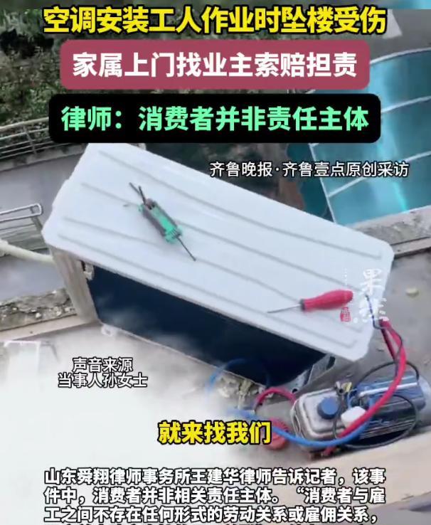 “这跟我有什么关系?”上海,女子在商场买了两台空调,师傅上门安装当天,女子在屋里就听“砰”的一声,过去查看发现一位安装工人意外从3楼坠落,事后伤者家属多次上门,认为事故出在她家,要求她来承担责任。 买个空调,怎么就买成了噩梦的开始,孙女士买好空调,师傅就爬到房子外面去装空调,本来一切都好好的,突然,“砰”的一声打破了孙女士的平静。 孙女士被这声音惊到,连忙去窗台边看,眼前这一幕让孙女士吓得腿软,只见楼下安装空调的师傅在地上躺着,孙女士吓得不轻,连忙拨打急救电话。 事故发生后,那个某知名空调品牌和那家大型电器商场,仿佛瞬间人间蒸发。品牌方说安装是商场负责,可订单上又白纸黑字写着品牌方承诺“包安装”。这种互相踢皮球的含糊其辞,在平时可能只是小麻烦,但在人命关天的时刻,就成了将消费者推出去的挡箭牌。 他们这种鸵鸟式的策略,直接导致了问题的激化。伤者家属在找不到正主的情况下,只能把所有委屈全部倾向给孙女士,他们就堵在孙女士家门口,要求孙女士进行赔偿。 于是,从8月27日晚上开始,孙女士的家门口变得不再安宁。六名伤者家属连续多日上门,理由听起来似乎很“直接”:人是在你家干活时出的事,品牌和商场都不露面,我们只能找你。这让感到委屈又无助的孙女士有家不能回,生活被搅得天翻地覆。 家属的焦急可以理解,毕竟亲人还躺在ICU里情况不乐观。但他们找错了门,也用错了方式。孙女士的身份,自始至终都只是一个购买空调服务的消费者。 她和安装师傅之间根本不存在任何个人雇佣关系。她听到响动后,第一时间拨打了120和110,已经尽到了一个普通公民的道义。 以“事故在你家发生”为由要求一个消费者承担赔偿责任,这在法律上是站不住脚的。这种行为,本质上是将维权的困境,转嫁给了另一个同样无辜的受害者。 坠楼的师傅,当时并没有按规定佩戴安全带。高空作业,安全带就是生命带,这是行业铁律。他自身的重大过错,是导致这起悲剧最直接的原因。 从法律上讲,工人的个人过错或许能减轻用人单位的赔偿比例,但绝不可能改变责任主体,更不可能把这口锅甩给消费者。说到底,品牌方和商场无论内部如何划分责任,都无法逃脱作为服务提供方和用人单位的法律身份。 孙女士的遭遇给我们所有人敲响了警钟。在家电、装修这类上门服务越来越普遍的今天,那个看似方便的“全包”承诺背后,可能就藏着一个责任模糊的陷阱。企业为了规避风险,层层外包,一旦出事,消费者就可能成为最终的压力承受点。 这起悲剧,不应该由孙女士这样的无辜者来买单。监管部门必须出手,让服务链条上的责任清晰化,不能再让企业有“隐身”的机会。 对此,你怎么看?