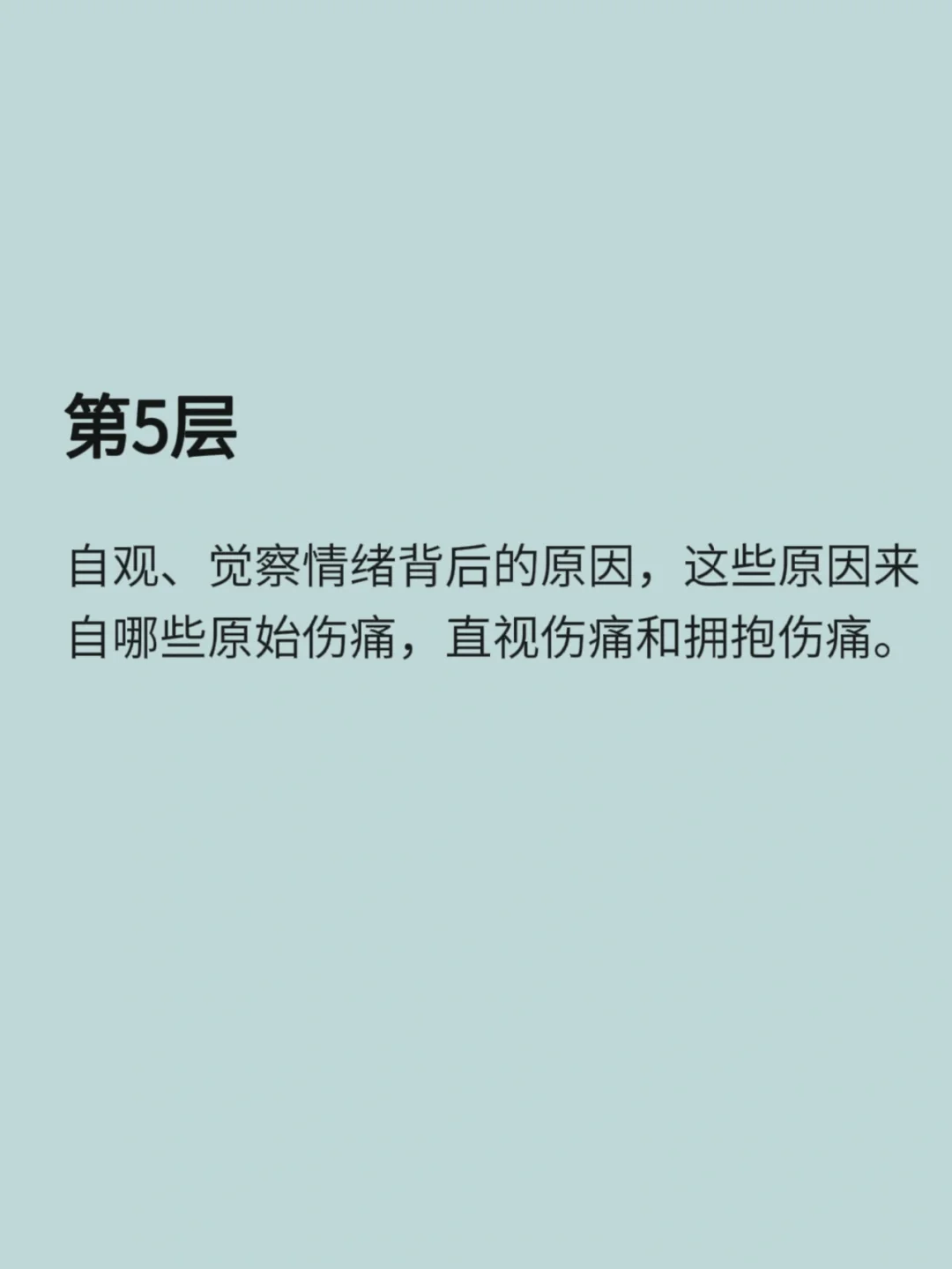第5层:自观、觉察情绪背后的原因,这些原因来自哪些原始伤痛,直视伤痛和拥抱伤痛。