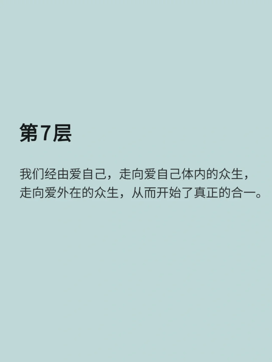 第7层:我们经由爱自己,走向爱自己体内的众生,走向爱外在的众生,从而开始了真正的合一。