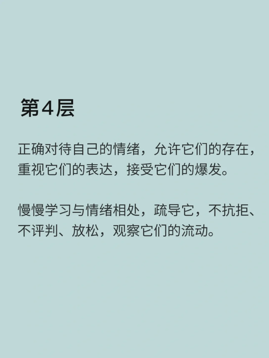 第4层:正确对待自己的情绪,允许它们的存在,重视它们的表达,接受它们的爆发。慢慢学习与情绪相处,疏导它,不抗拒、不评判、放松,观察它们的流动。