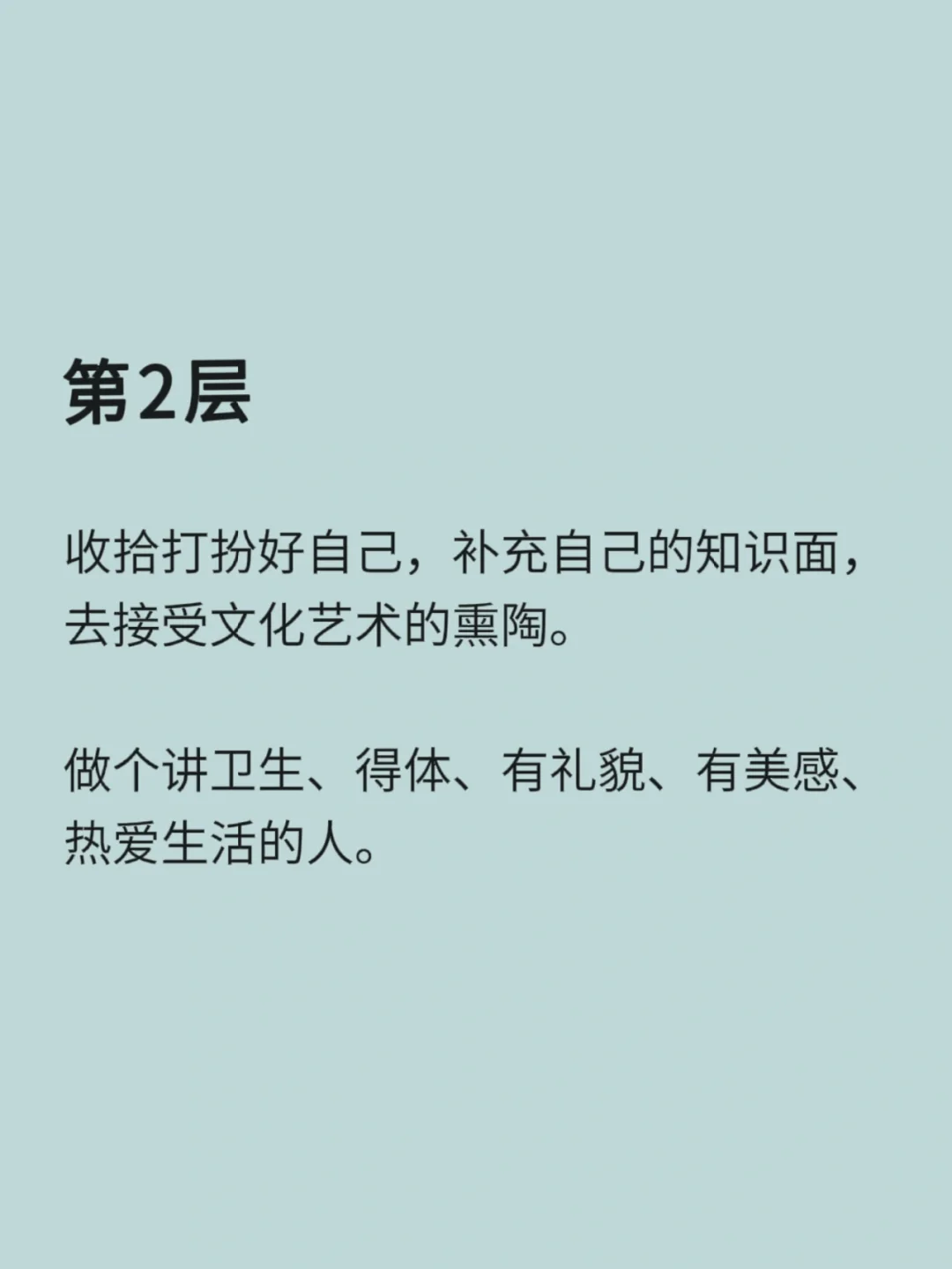 第2层:收拾打扮好自己,补充自己的知识面,去接受文化艺术的熏陶,做个讲卫生、得体、有礼貌、有美感、热爱生活的人。